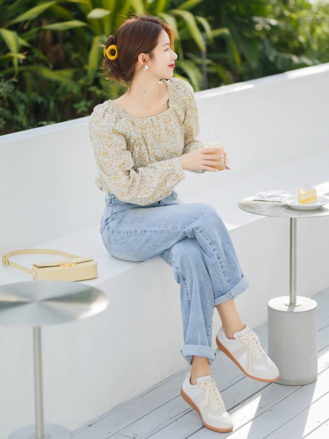 同樣也是中和風格的穿法:溫柔的碎花上衣+中性的高腰褲,帶點輕熟feel~