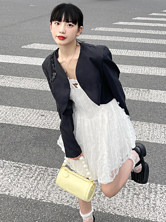 這套就很適合骨架小的矮個子女生,短西裝直接拉高腰線,加上小墊肩修飾窄小的肩膀,看起來人也更加利落挺拔。