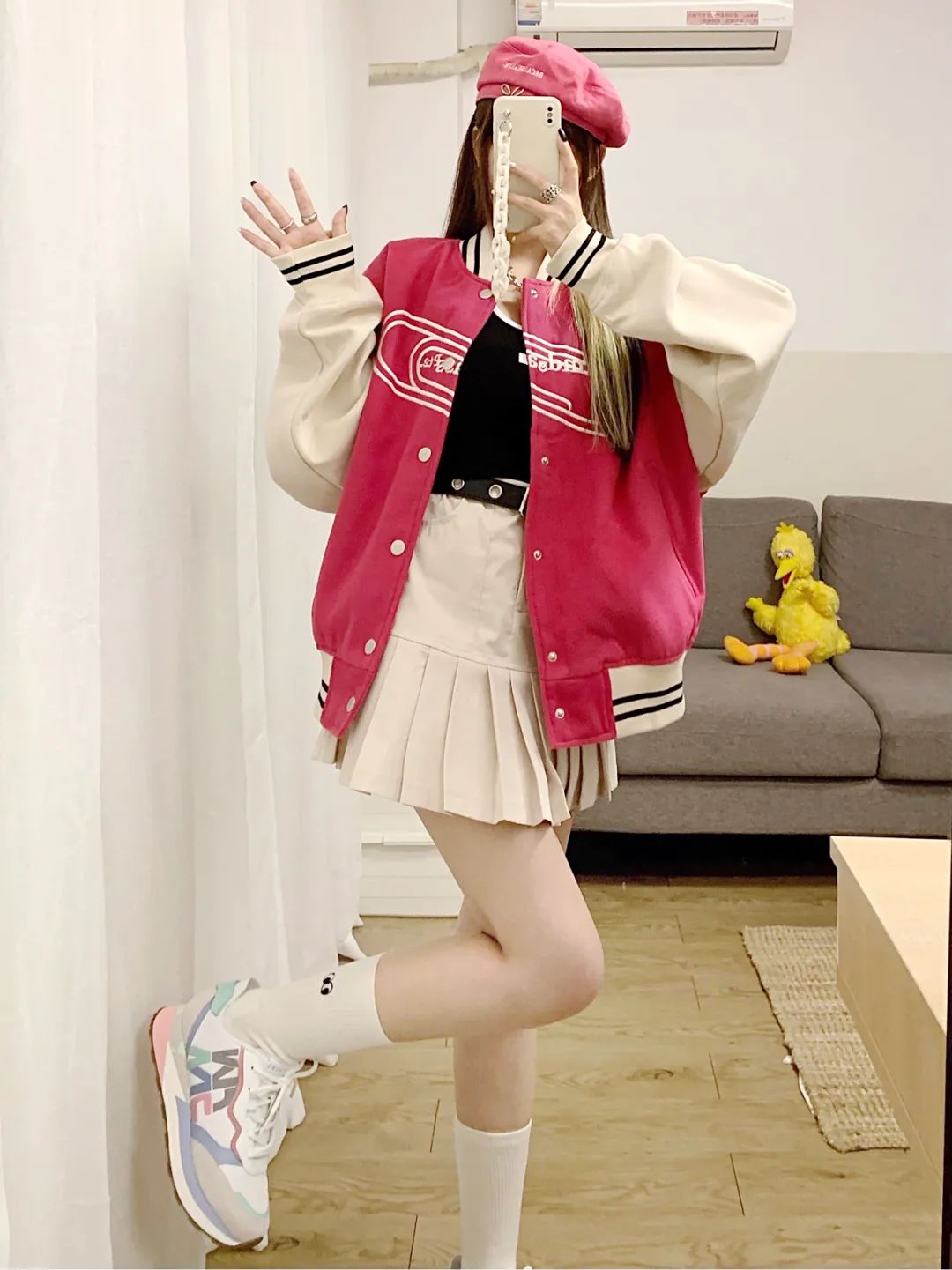 秋天的衣櫃裡怎麼少得了棒球服!熱的時候可以脫下,早晚又能起保暖作用。裡面簡單搭配一件短上衣,轉身就是辣妹~