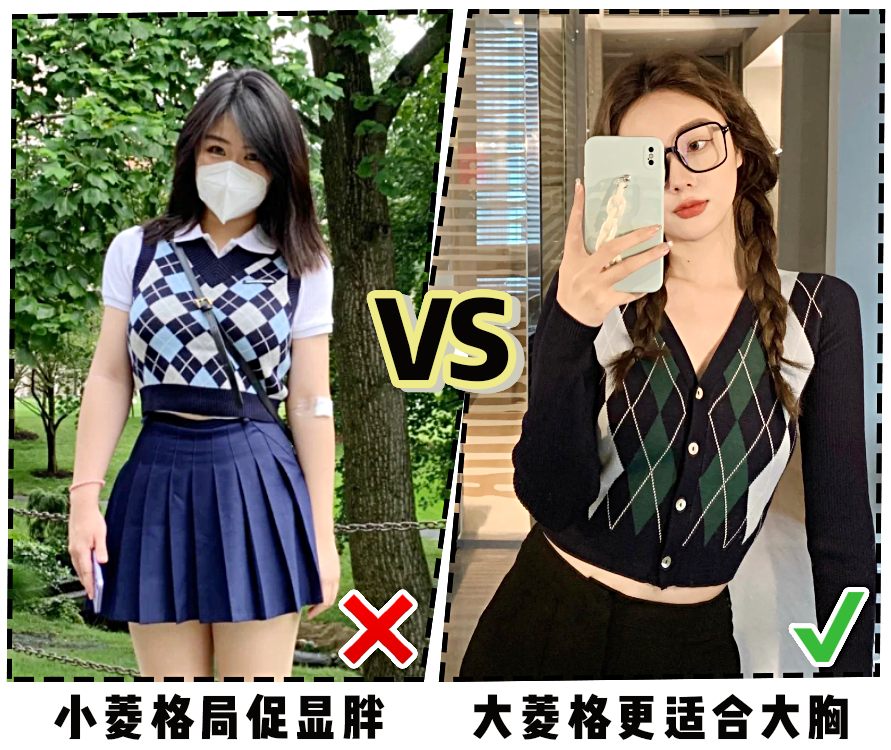 不過要注意的是,大胸姐妹就不要選分布太滿的小菱格,看起來很有窄小感,雙倍顯胖。
