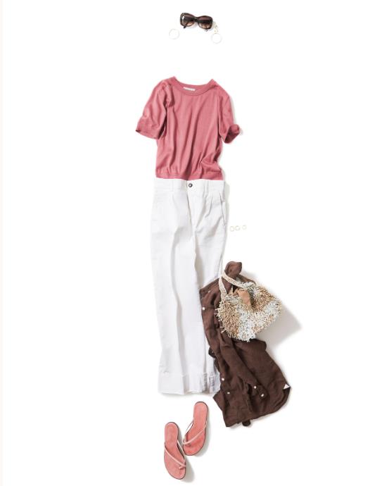 粉色T恤配白色褲子,怎麼少得了棕色襯衫的優雅強化?正是它的出現 ,讓整體造型晉級為高高在上的大氣之列。