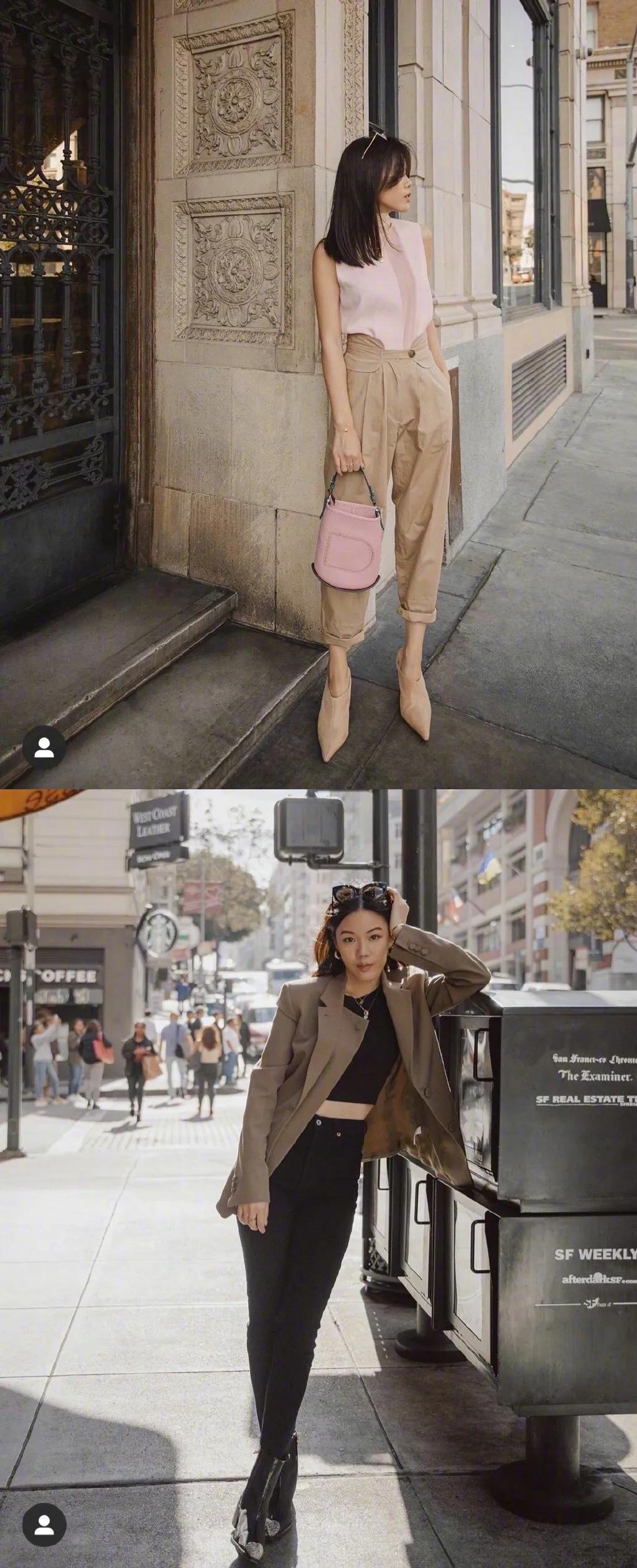 這種早秋混搭,顏色不宜過多,選擇一條基本款黑色高腰長褲,直接先把長腿凸顯出來,內搭一件短褲露腰背心,十分又那種歐美博主的簡約高級感,早晚套上一件奶茶色西裝,利落溫柔又高級。
