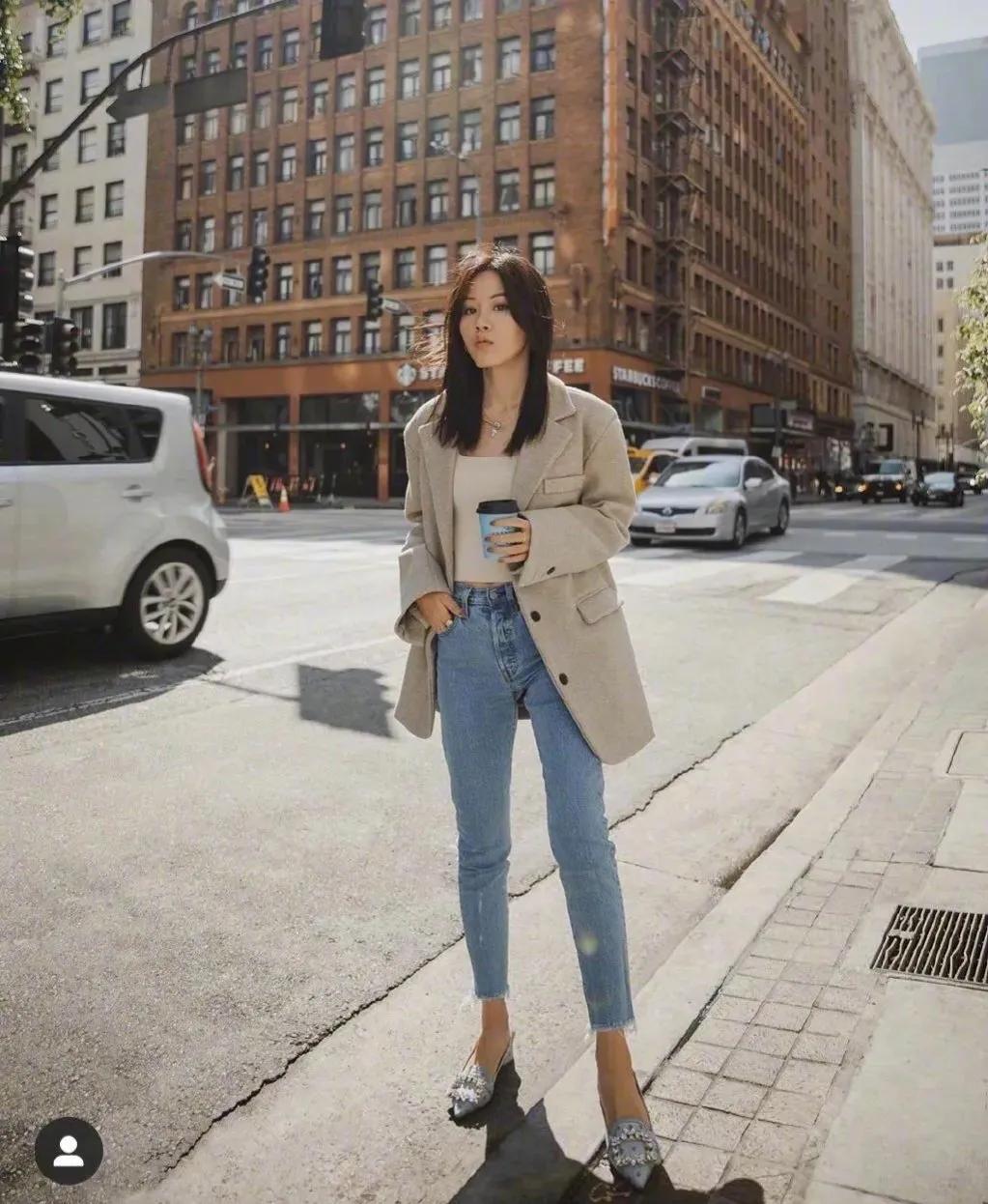 吊帶衫是很多女生夏天喜歡穿的,到了秋天我們也可以拿它當內搭,小量感搭配一條高腰的白色牛仔,輕鬆凹出好比例,早晚加一件針織或者西裝外套,都超好看。