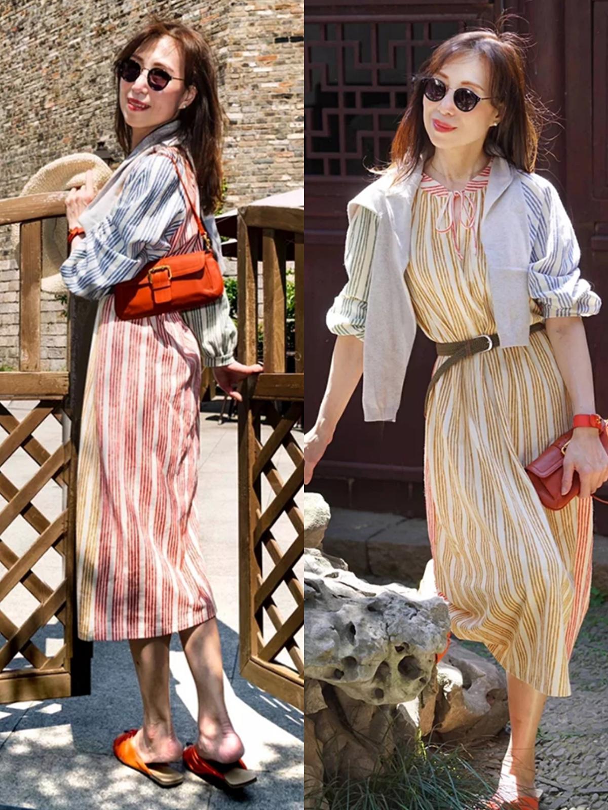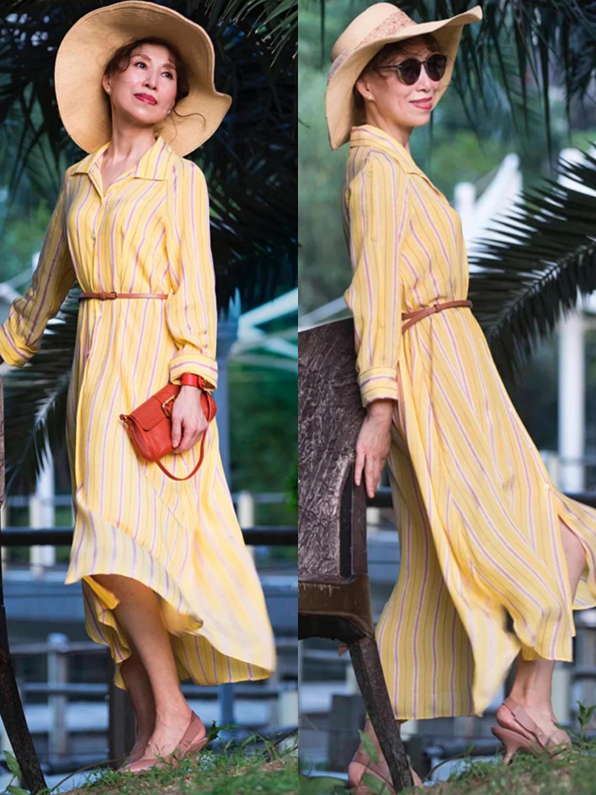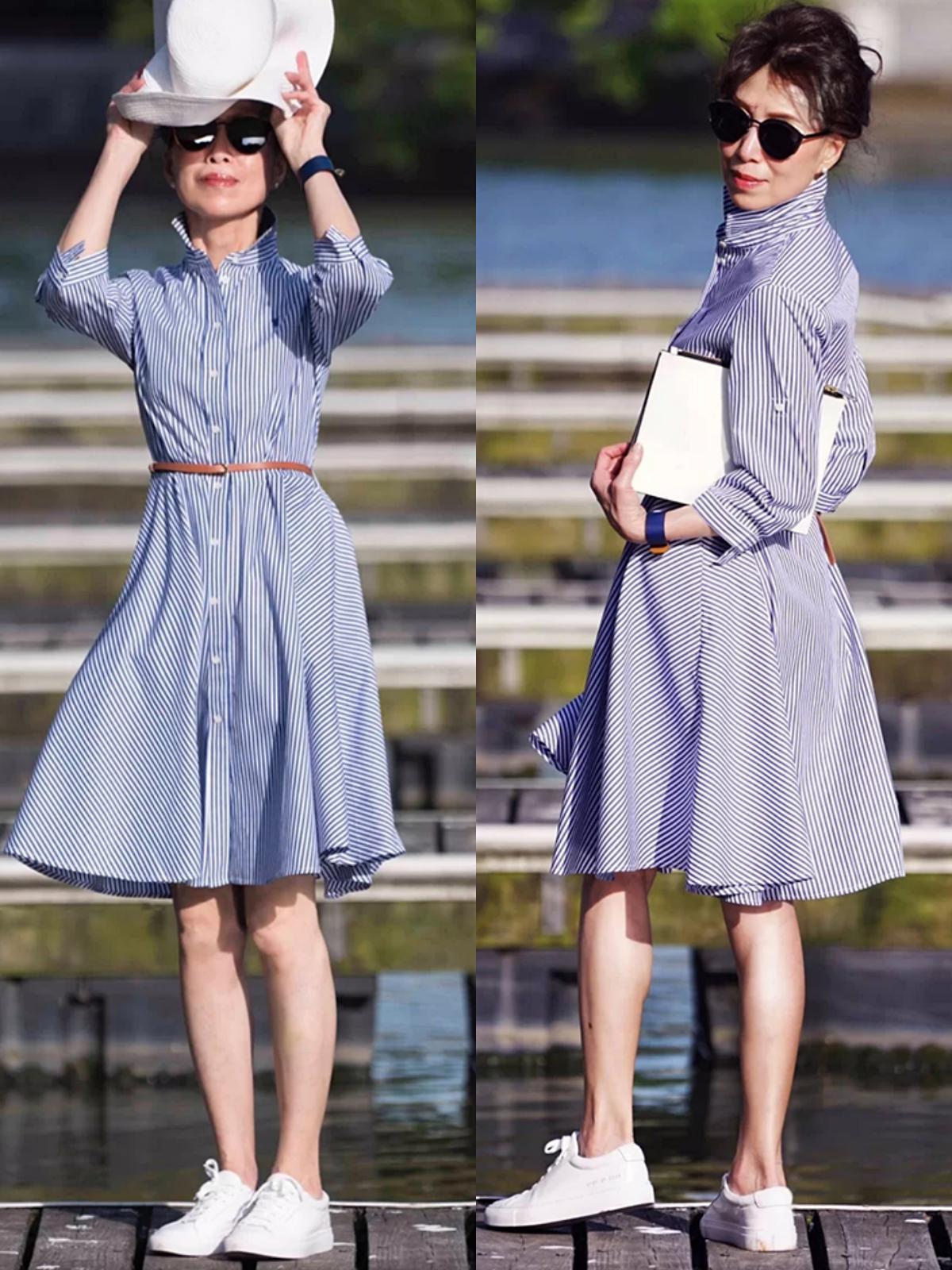 並且,襯衫裙對60歲女生的身材包容度很大,無論是微胖還是個頭矮,非但不用擔心駕馭不了,自帶條紋或者格紋元素的襯衫裙,還能起到改善身材比例作用。