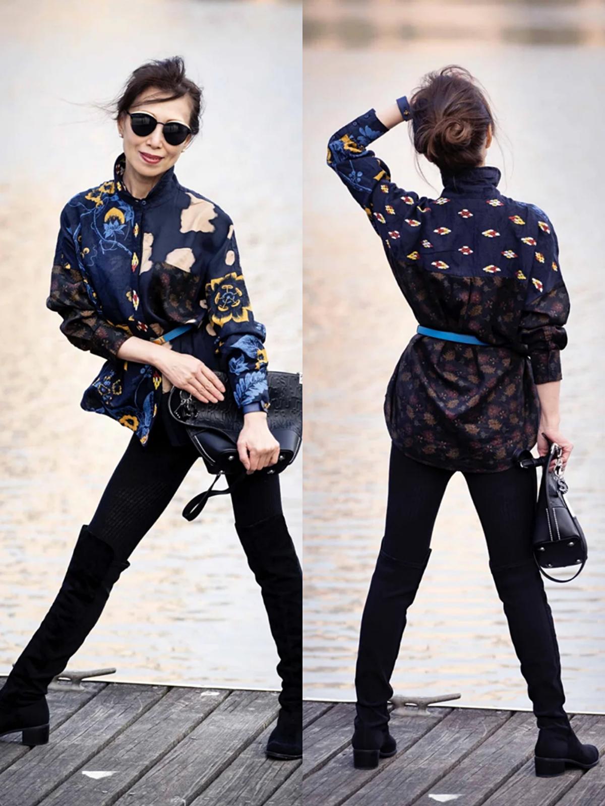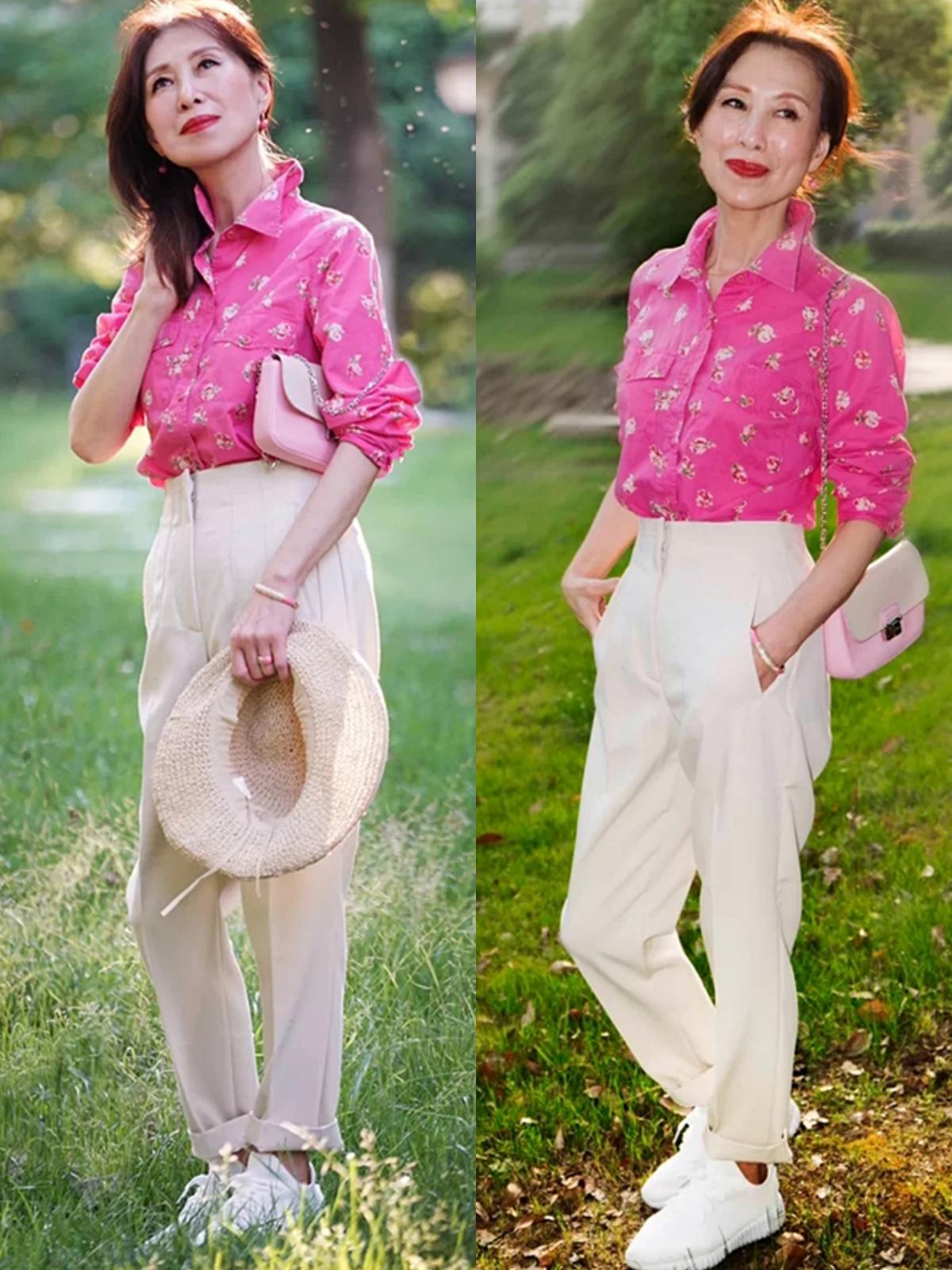 而用彩色系碎花襯衫取代純色系襯衫,在起到減齡效果的基礎上,還有助於使穿衣重心上移,以及提亮膚色。