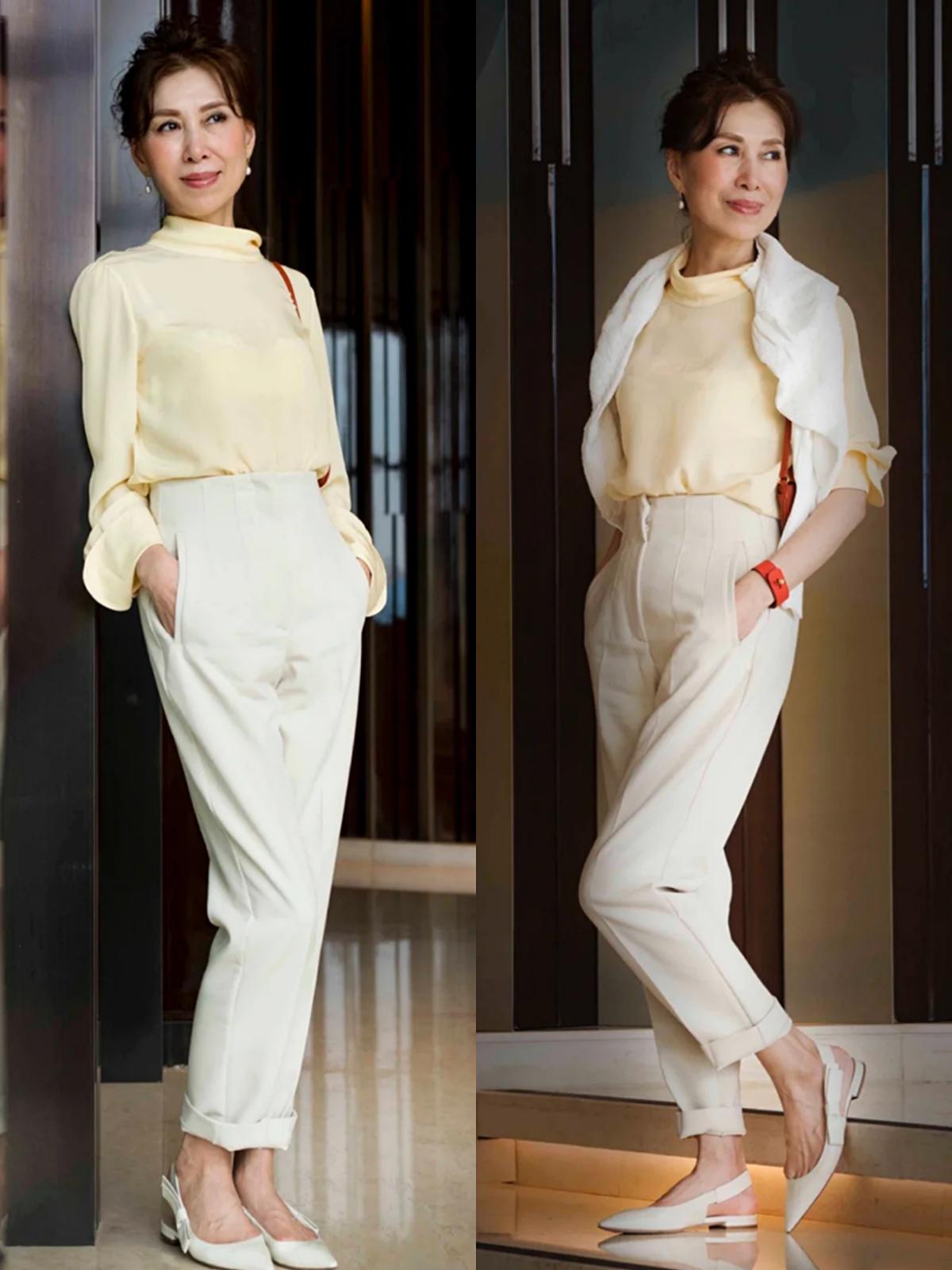 但這些基礎款對穿搭者自身氣質要求很高,步入60歲這一年齡階段後,穿不好很容易給人老氣橫秋之感,整體造型也不夠惹眼。