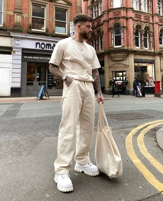 或許有的男士無法接受米白色的長褲,那不妨用一條米白色的上衣來與一條寬闊的黑色西褲形成呼應。