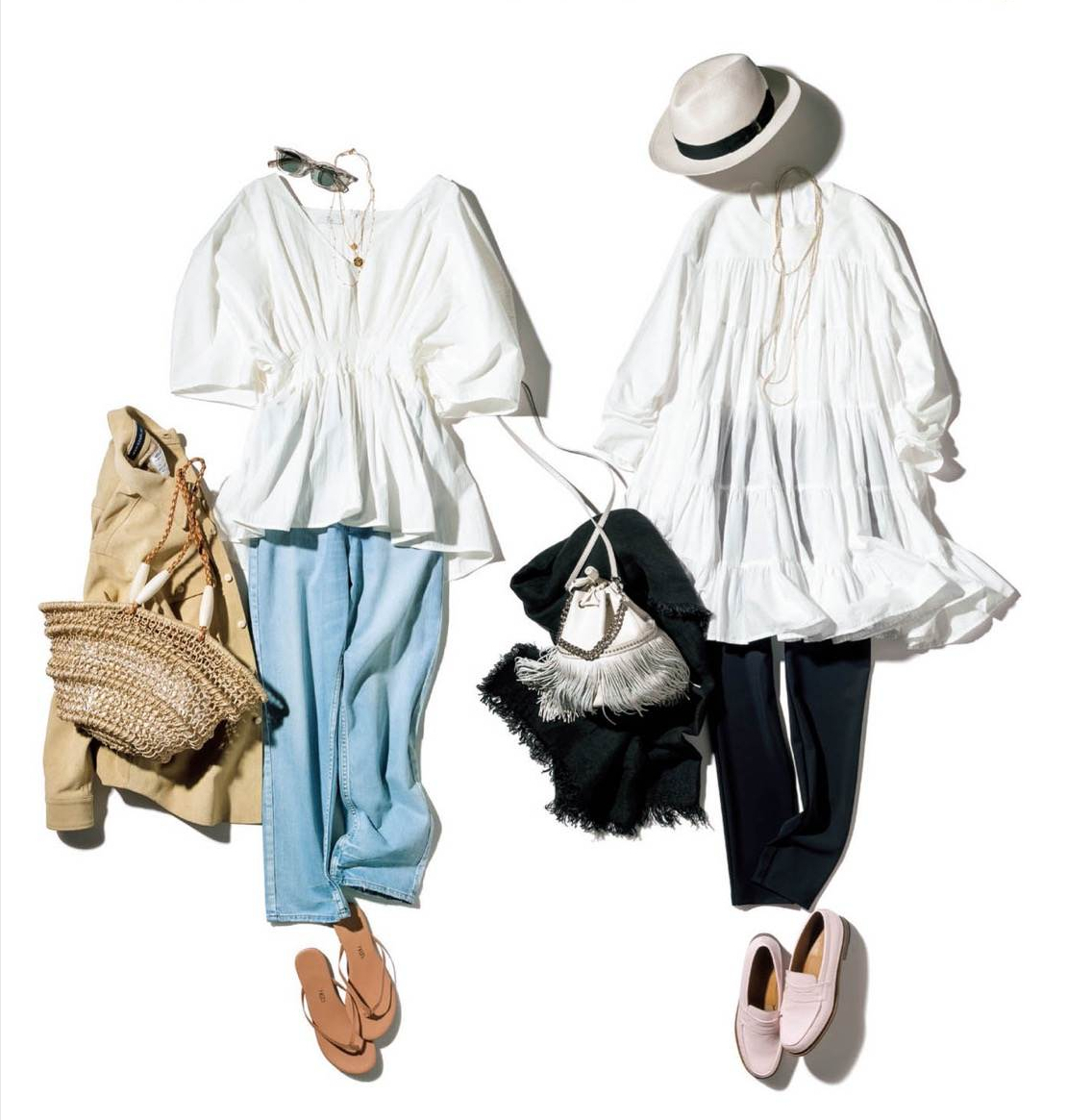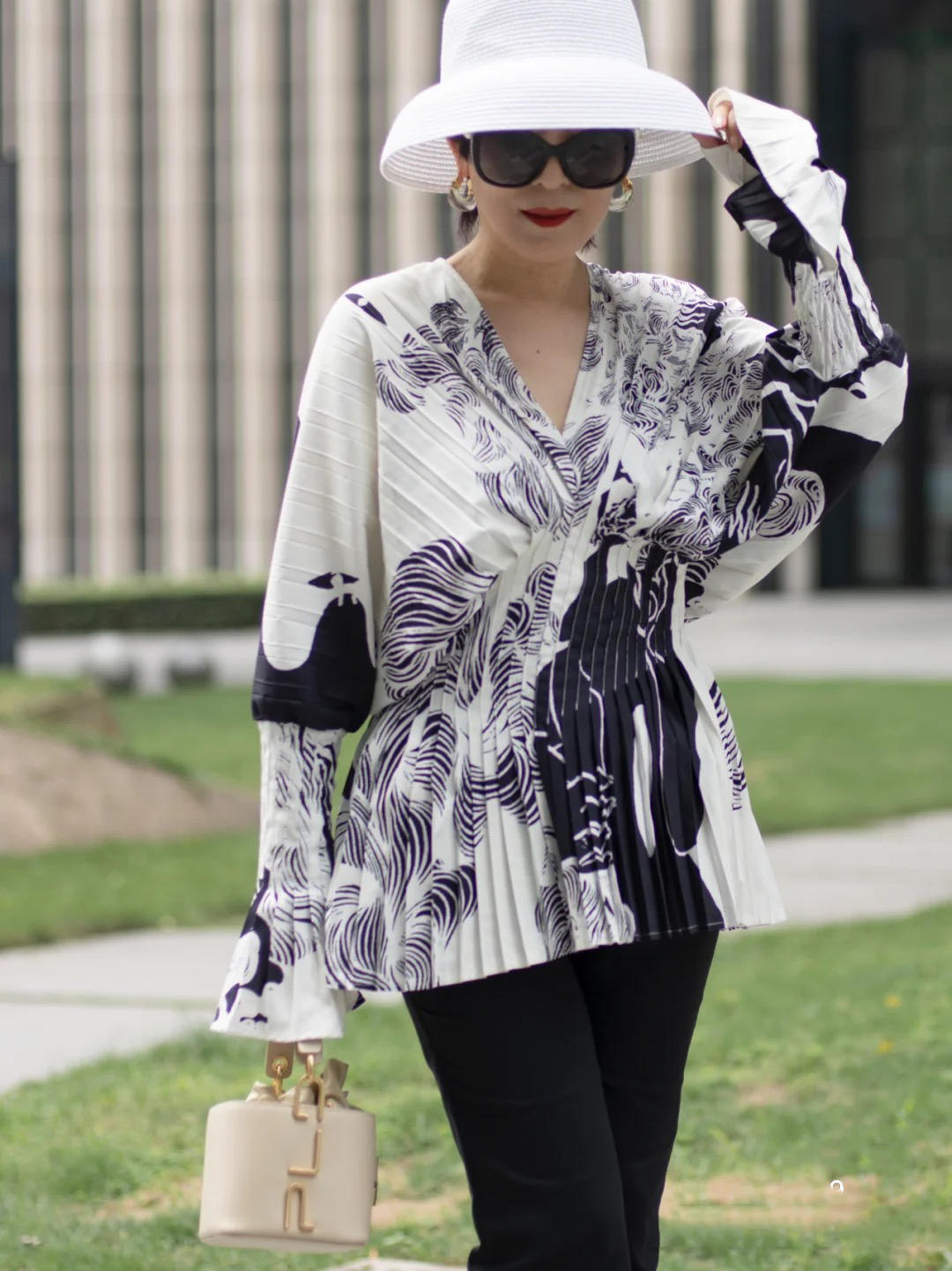 抽褶襯衫、寬鬆的下擺,搭配一條黑色緊身褲,輕鬆又自在。對於寬鬆的上裝,修身的下裝是化解著裝松垮、邋遢的要點。