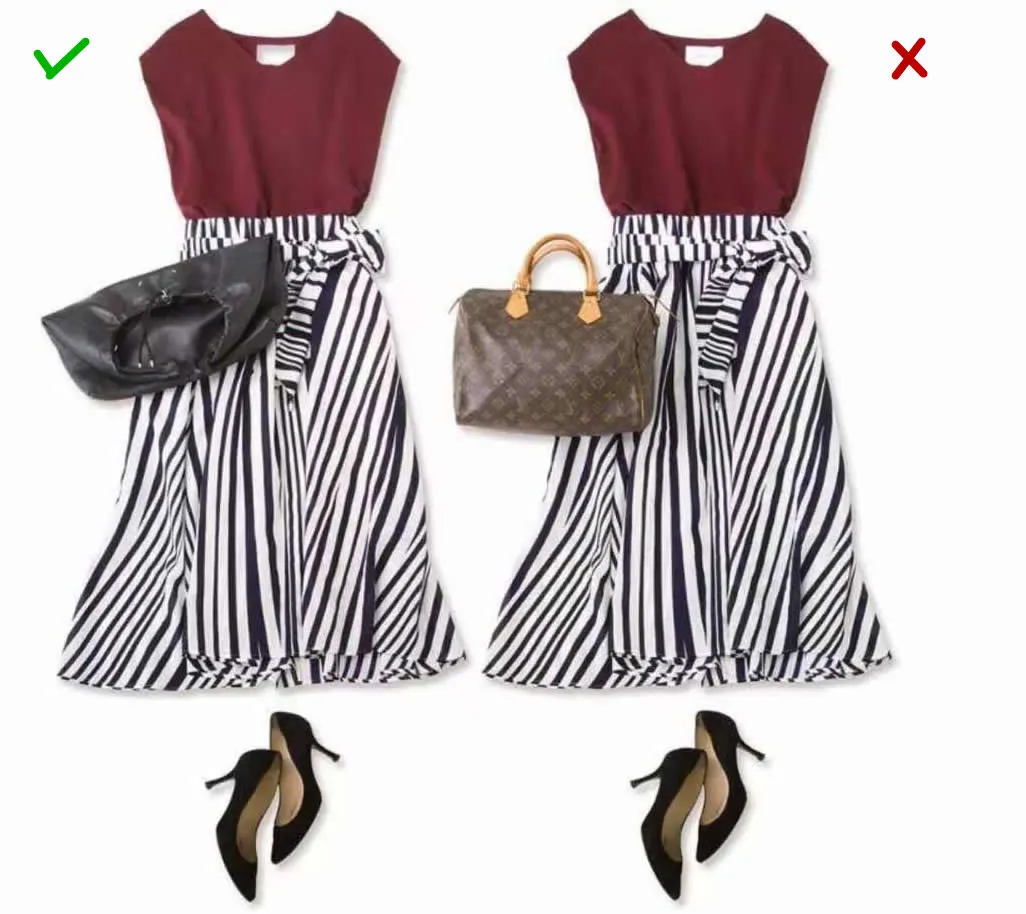 一繁一簡的搭配,除了可利用在上下裝之外,還可以是大小組合。例如繁雜的碎花長裙,視覺感官非常強烈,利用簡答的深色單品來抑制,或是腰帶、或是包包、亦或者是鞋子等。