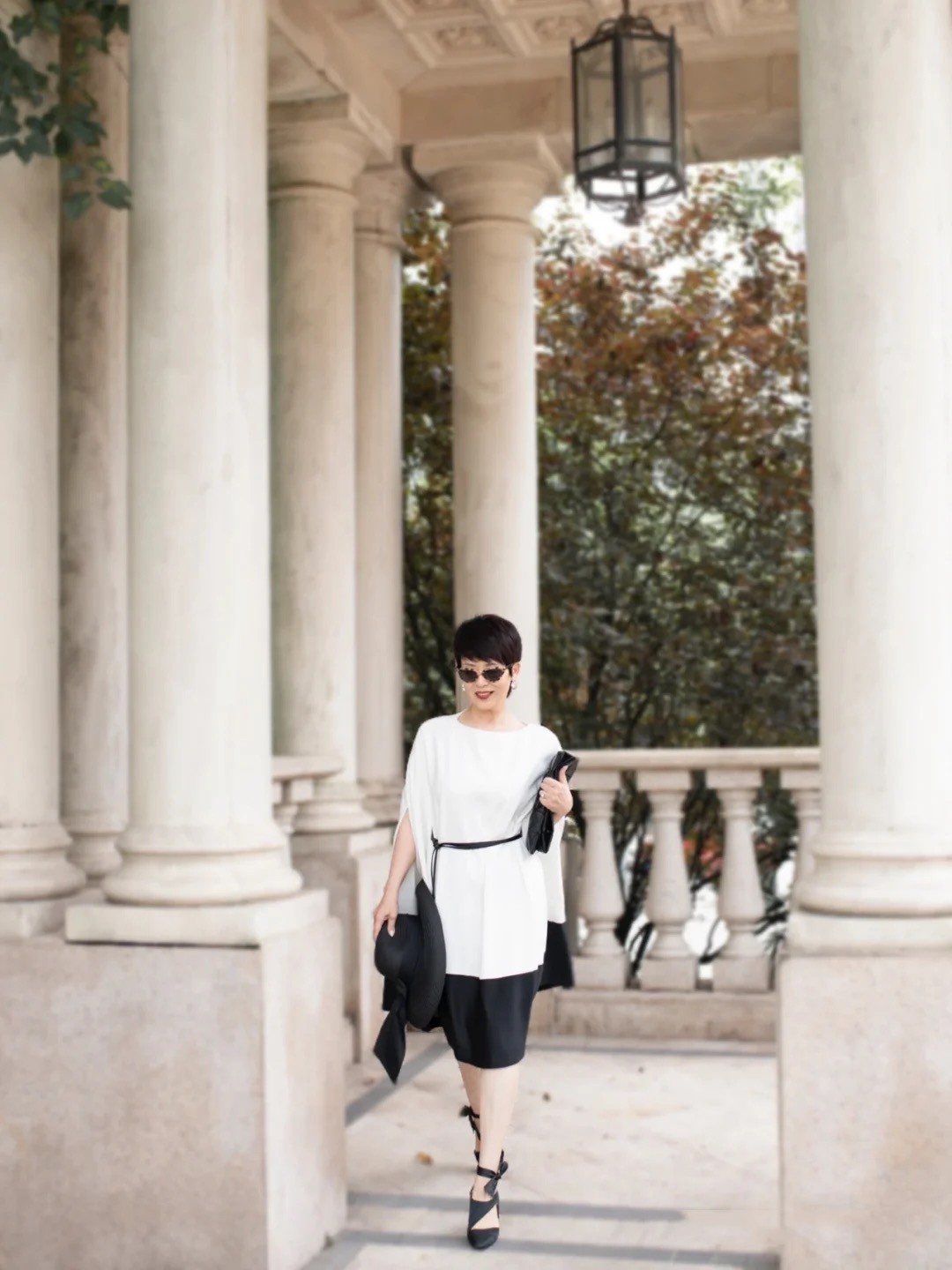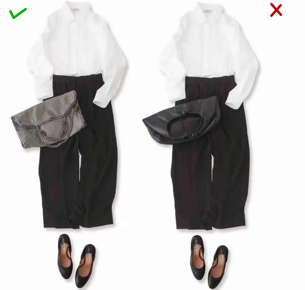 另外,色彩的分割方法,也極具顯瘦效果。例如這一身中的上半身穿搭,比起大面積的白色或黑色,黑色將白色分割的方法在視覺上會更顯瘦。