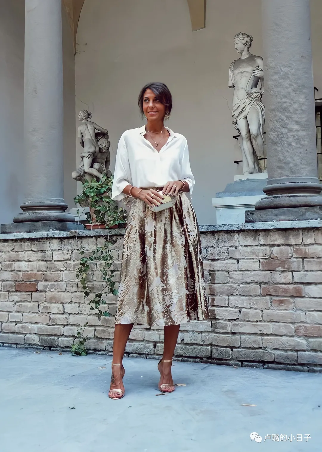 天氣如果還算涼快,就可以試試白色襯衫搭配一條金色的半身裙,配合一雙一字帶涼鞋,領口處微微開個口,既帶有職場女性的一絲颯爽,但是又不失高雅。