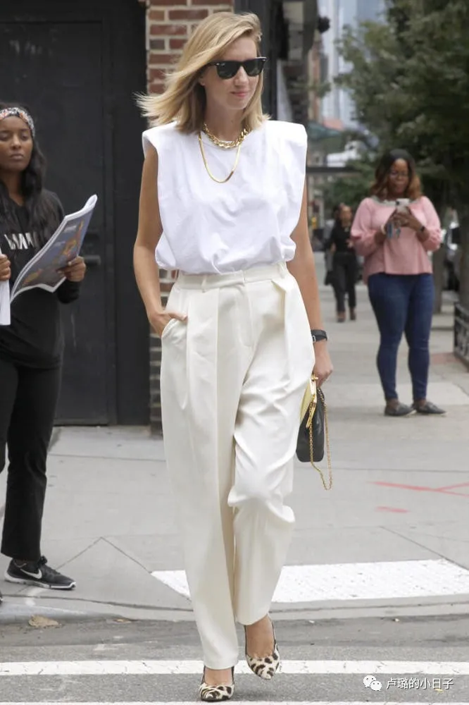 白色高領襯衫搭配高腰闊腿褲,再搭配一件墊肩白色西裝外套,一套非常的颯爽、幹練,隨隨便便一張街拍,都是妥妥的女強人。