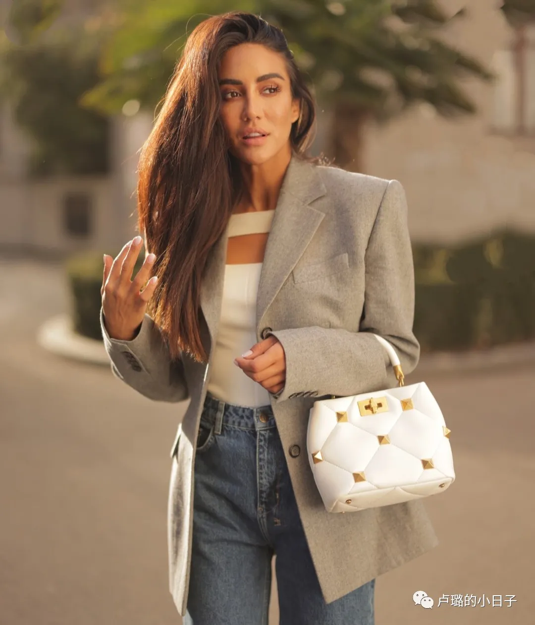 包包主體為白色,與白色鏤空吊帶裙相搭配,金色鉚釘與首飾顏色統一,整體穿搭既和諧又亮眼。