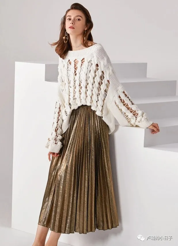 內搭可以搭配一整套的金色長裙,一整套穿搭全部圍繞金色和白色進行搭配。