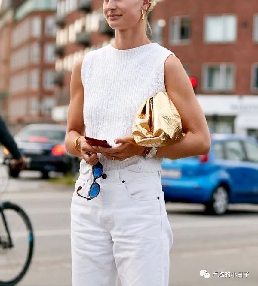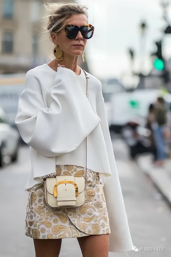 在整套衣服的穿搭裡,金色都隻占了小比例面積,所以,在包包的設計上,金色占比也不大,這樣更能襯托出主體的白色,同時也為穿搭增加了特色。