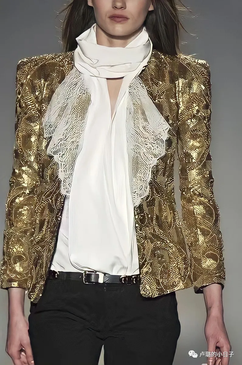 純金色外套沒有了其他花紋的修飾,對金色的飽和度、衣服的質感和剪裁要求就會更高,因為大面積的金色會吸引住所有的注意力。