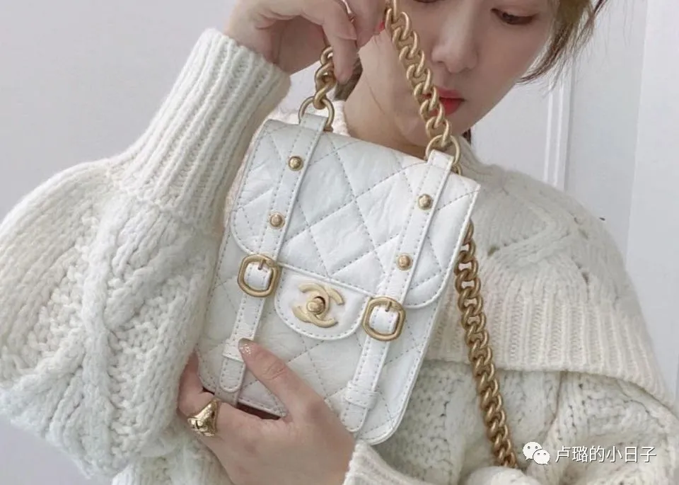包包鏈條和LOGO都是金色,在大面積白色中就很突出。