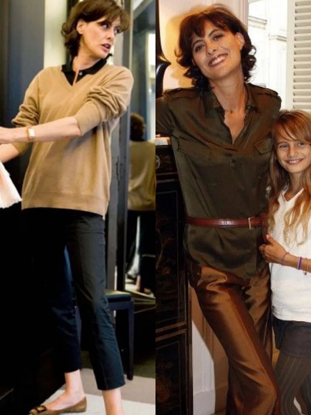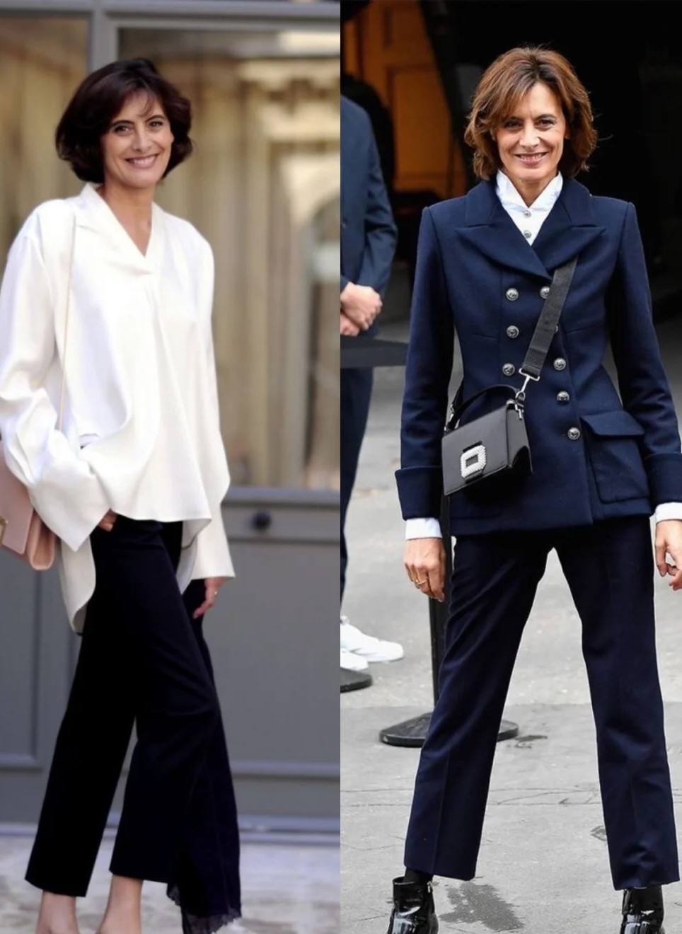 如襯衫、西裝、針織衫、牛仔褲或者西褲,這些構成了她大多數出鏡look。簡潔利落的深色系長西裝配焦糖色直筒褲,花瓣領襯衫增添俏皮感,颯爽率性又不失優雅。