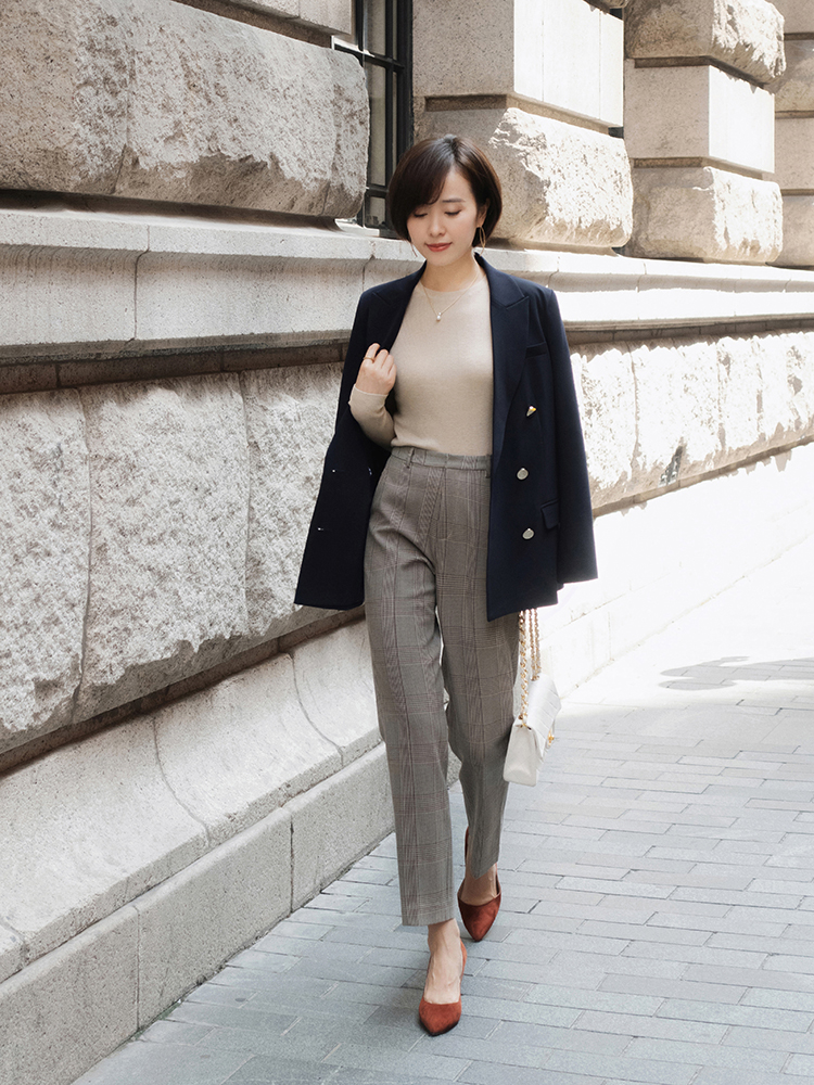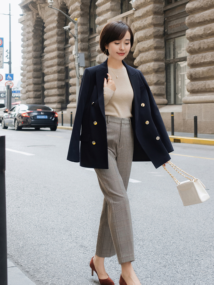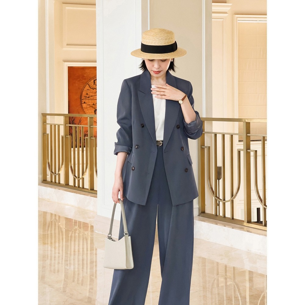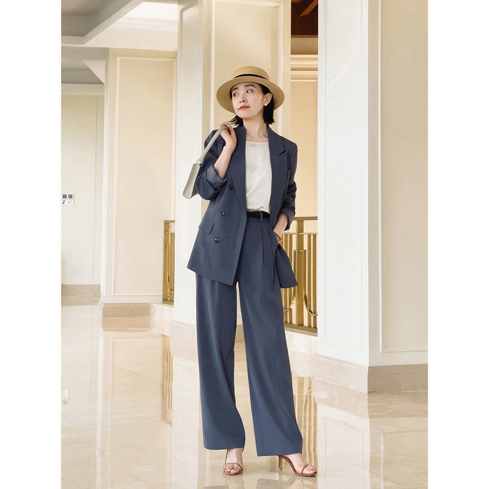 穿起來的造型會更加的立體,因此女性可以多多選擇這樣的褲款,藍色的小西裝搭配藍色的寬鬆西褲,高級且即使是撞色也不會顯得很單調。