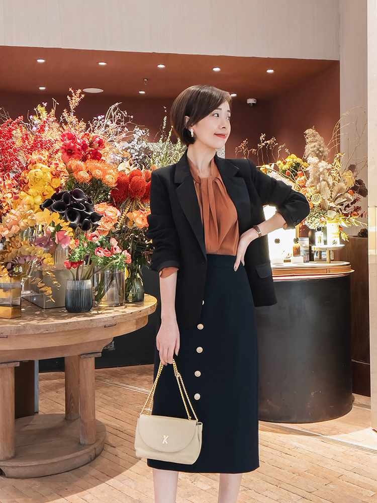 小襯衫領口的設計,讓整體的穿搭更加大氣,但是又不顯得很單調,這樣的穿搭能夠優化女性的霸氣感。同時身材線條感也設計得很好,腰部的身形很突出。