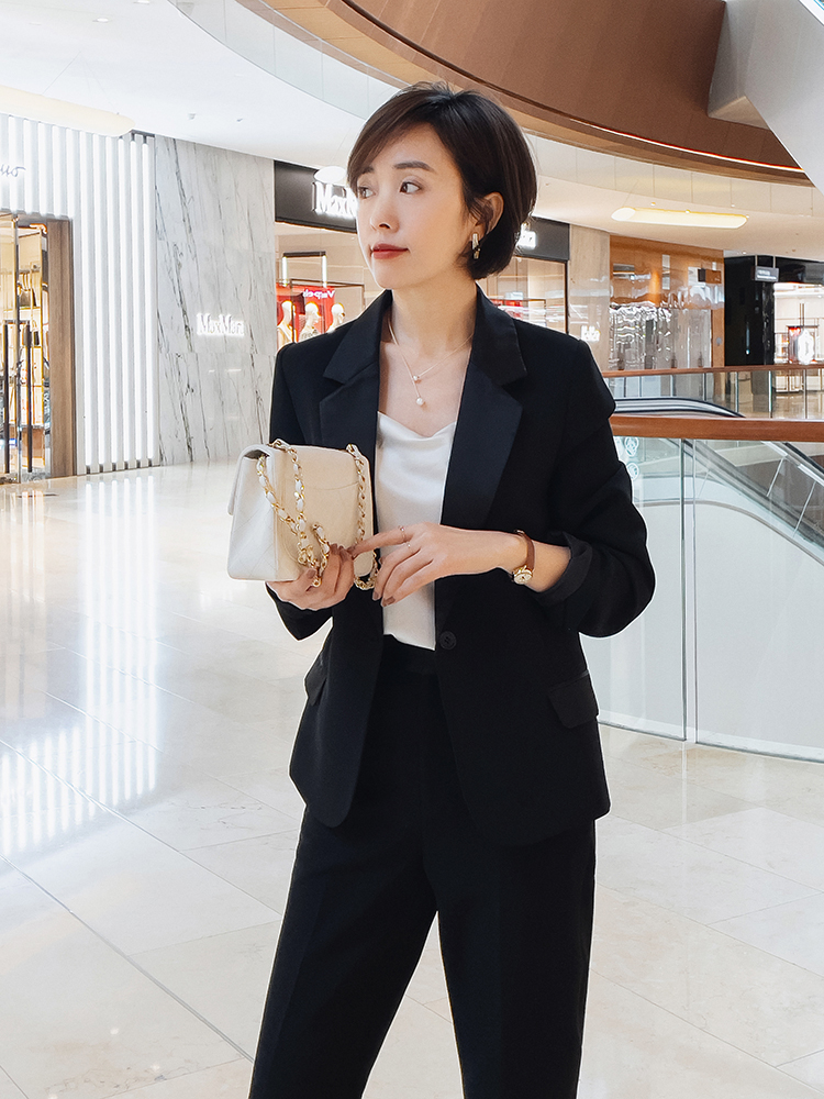 穿全套黑色的時候,怎麼樣才能夠避免單一感?首先就是用一些別的顏色來作點綴。例如這樣黑色的西裝搭配黑色的西褲,配上一件白色的打底衣,有層次感又好看,搭上一雙高跟鞋還可以提身高。