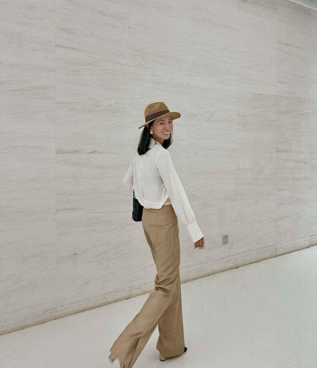 類似於白色、米色襯衫,則是對大部分人很友好的類型,還能夠通過配合喇叭褲、闊腿褲來創造出有氣場的穿搭。