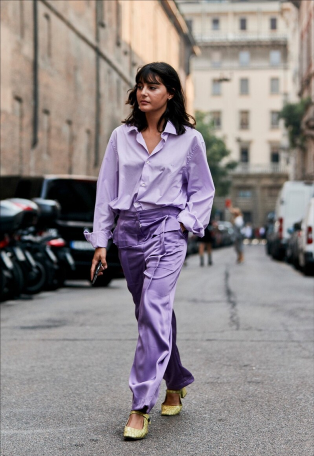淺紫色的寬鬆襯衫有比較夢幻的美感,是很多人都夢寐以求的穿搭,結合著深紫色的華貴質感讓顏色有很自然的變化,但意境卻沒有一點違和效果,有著比較強的凝聚力。