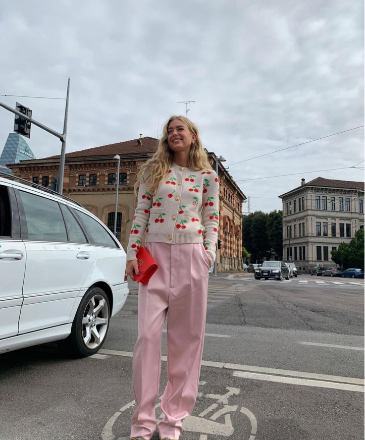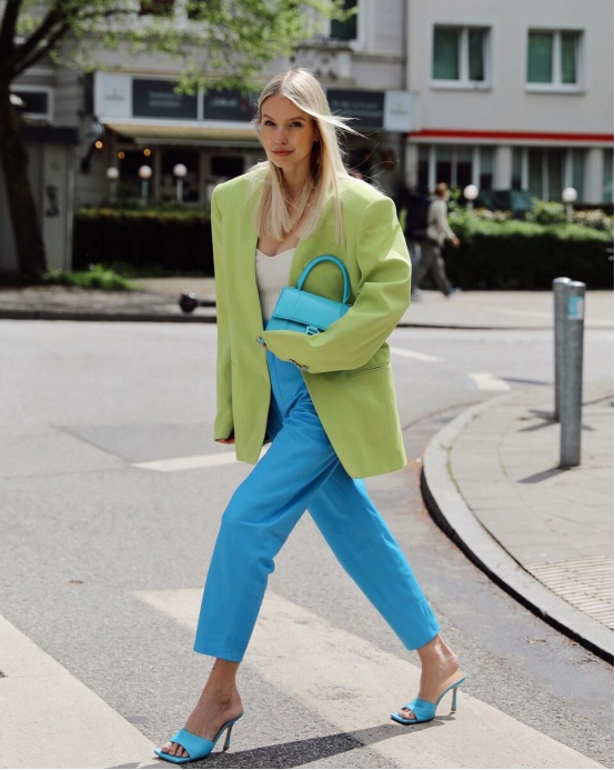 天藍色的褲裝和青果綠的休閒西服外塔做搭配是非常有吸引力的,明明版型上都是很基礎的、並沒有很強的設計,甚至兩件單品都運用淨版的款式,但卻能在人群中一眼就被看到。