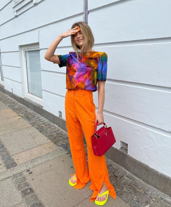 撞色就是對比色的一種簡稱,對比色的使用是非常具有張力的,尤其是大面積的使用會更搶鏡。亮橘色的耀眼感是很強的,大部分的暖色系單色都具有更強的時尚效果,但並不是很好駕馭。