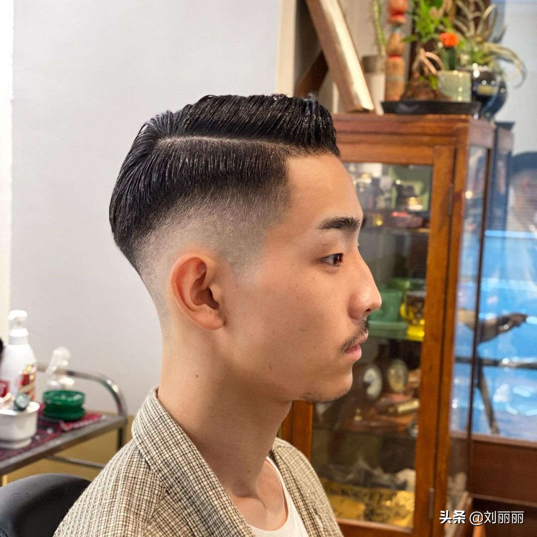 二八分油頭造型整體梳理得比較工整,根據頭型周邊鏟短,後區不用推得太高,前額瀏海露出額頭,穩重時尚不落伍。