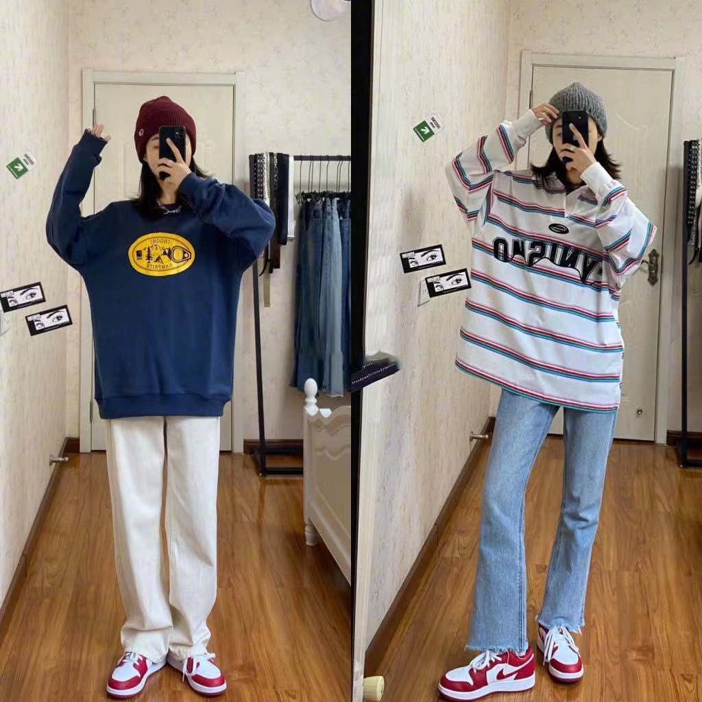 秋季的休閒風穿搭還是比較簡單的,因為秋季有許多的單品都是比較休閒也比較有運動氣息的,墨藍色的寬鬆衛衣給人的運動氣息就非常濃厚。一個橢圓形的圖案設計,也讓衛衣多了幾分時尚感。