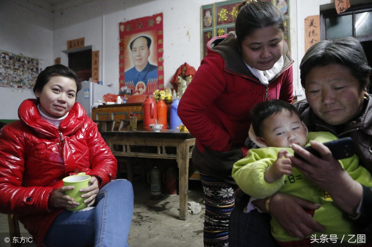 兩層小樓、冰箱、彩電樣樣齊全。黎氏美珠說,這裡樣樣都好,自己算是找到好歸宿了。兩人隨後有了孩子。陳德平給兒子取名叫陳越華,「越華」二字的含義不問可知。圖為姐姐和婆婆在跟孩子玩,黎氏錦亨在一旁看電視。黎氏美珠一歲半的兒子陳越華正在看手機。(圖片來自東方IC)
