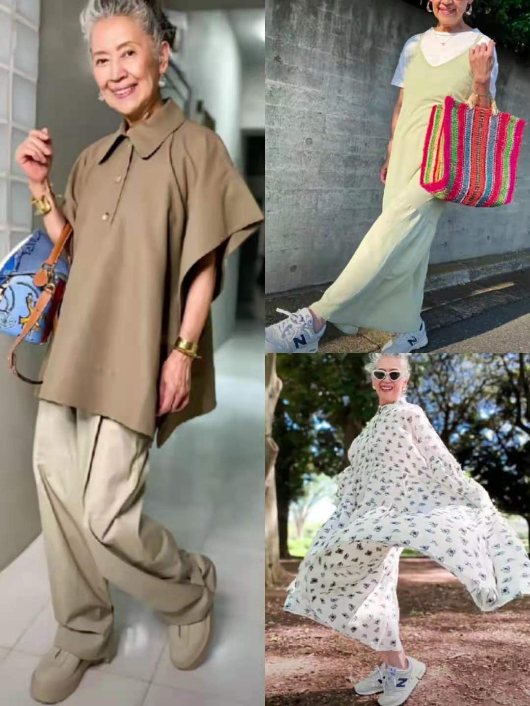 日本70+博主內藤奶奶便是球鞋的忠實愛好者,無論是卡其色球鞋,還是白色球鞋,都被她用來凹造型。