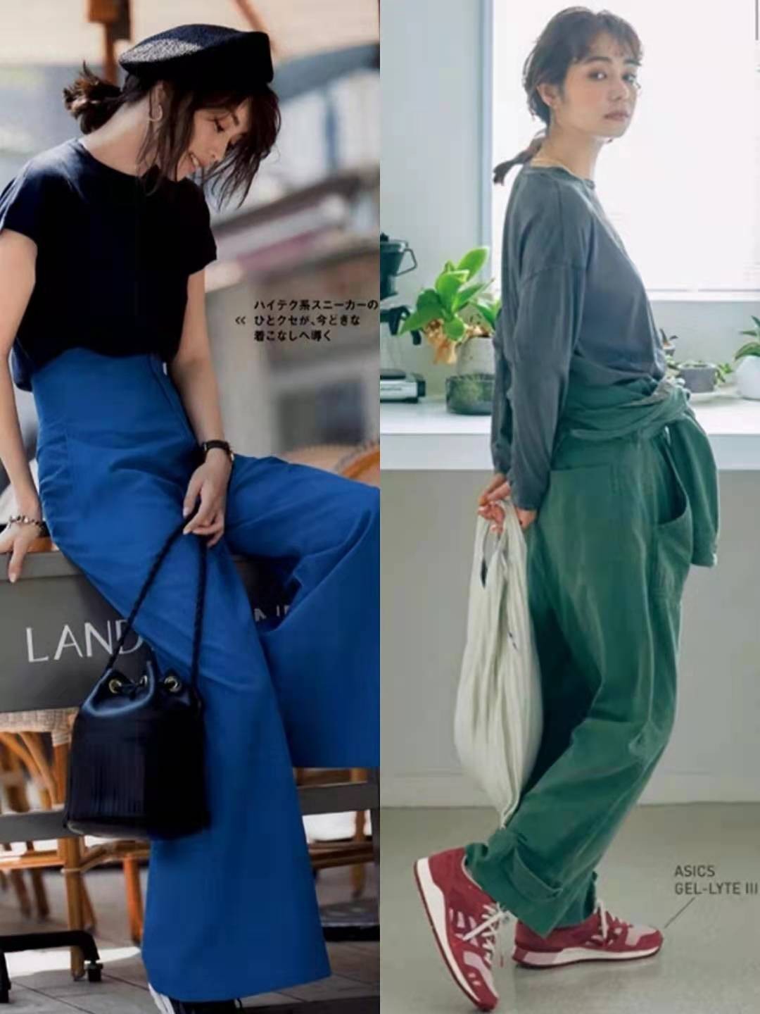 雖說球鞋更適合配直筒褲或者小腳褲,但只要注重搭法,球鞋+闊腿褲也能營造出時尚感。例如用高腰闊腿褲取代低腰款,亦或者將褲腿卷起一截,率性而灑脫。