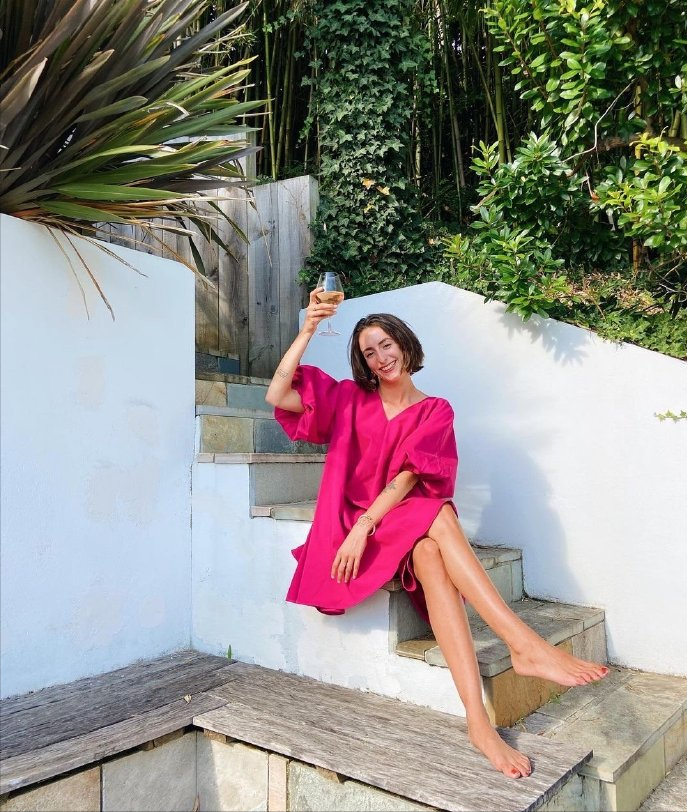 身著一件艷麗的玫紅色裙子,過於飽滿的女生味顏色竟也能與氣質神態裡浮現的優雅吻合。長相偏利落,絲毫不影響法式風的呈現。