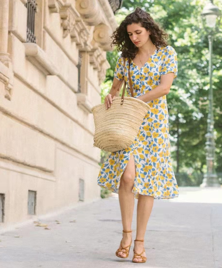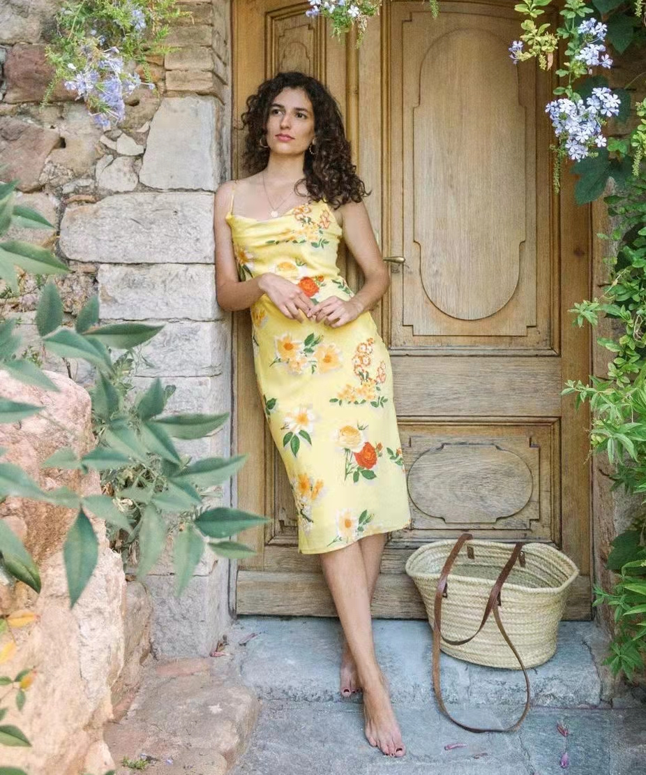 黃色吊帶裙,大朵大朵的花朵鑲嵌,並不顯得突兀,這得益於底色與花色的一脈相承,非常考驗選品眼光。熱烈怒放,卻極有分寸。