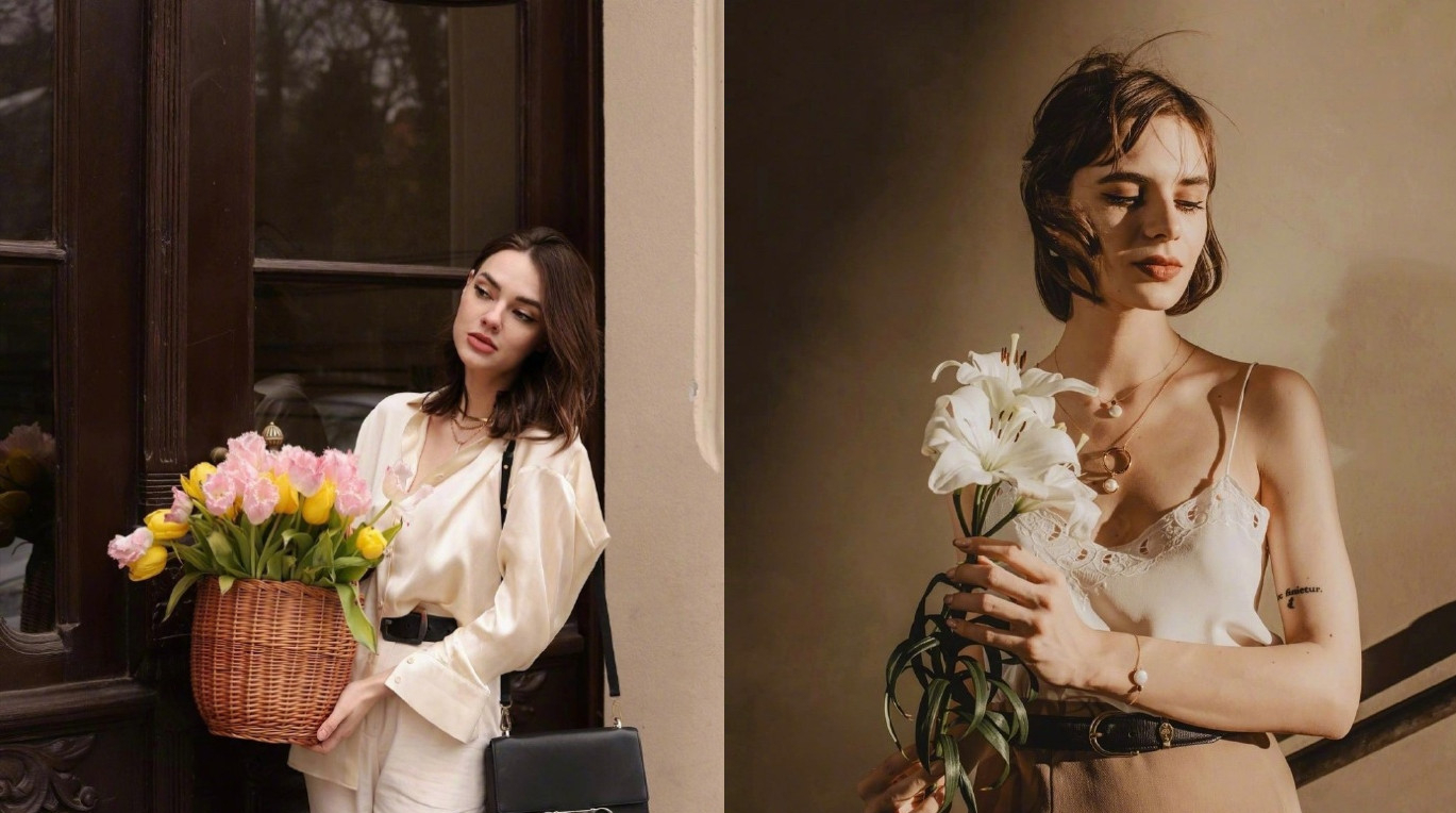 不可否認,五官長相端莊,更容易塑造出女生味十足的優雅法式風。先天優勢+後天穿衣造勢,讓最終的穿衣美得如同一幅畫。這類美女級別的博主並不太多。↓