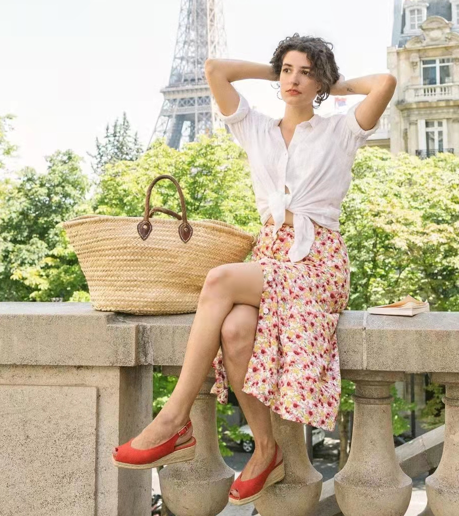 草編坡跟鞋,無論涼鞋、還是其它鞋型,必是春夏法式風的經典。它的出現,一般都配合著草編包、浪漫長裙一起,為的是這片明媚的田園風光。