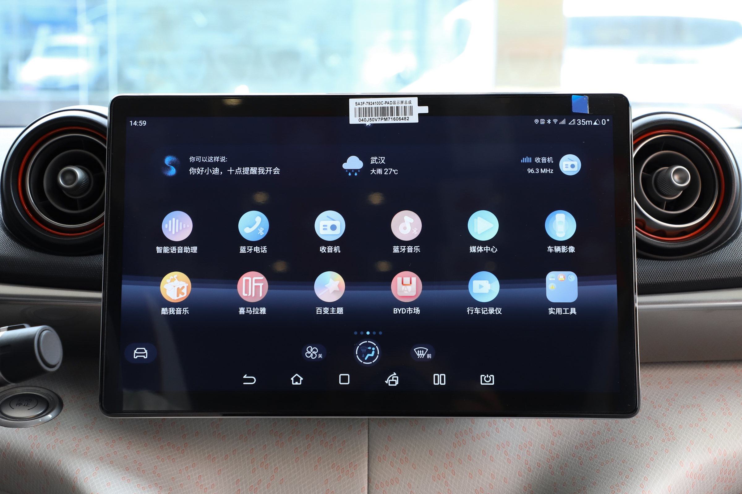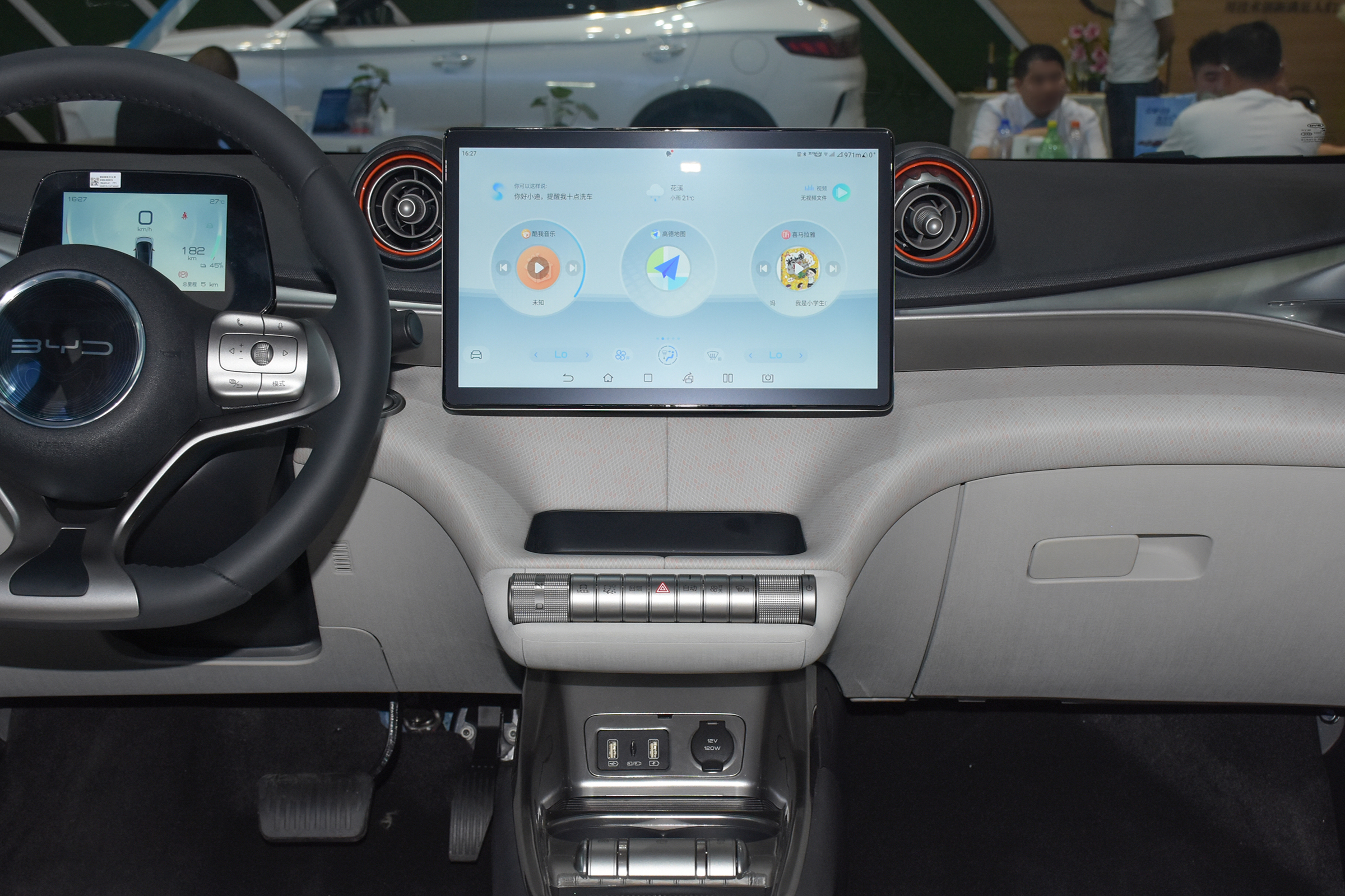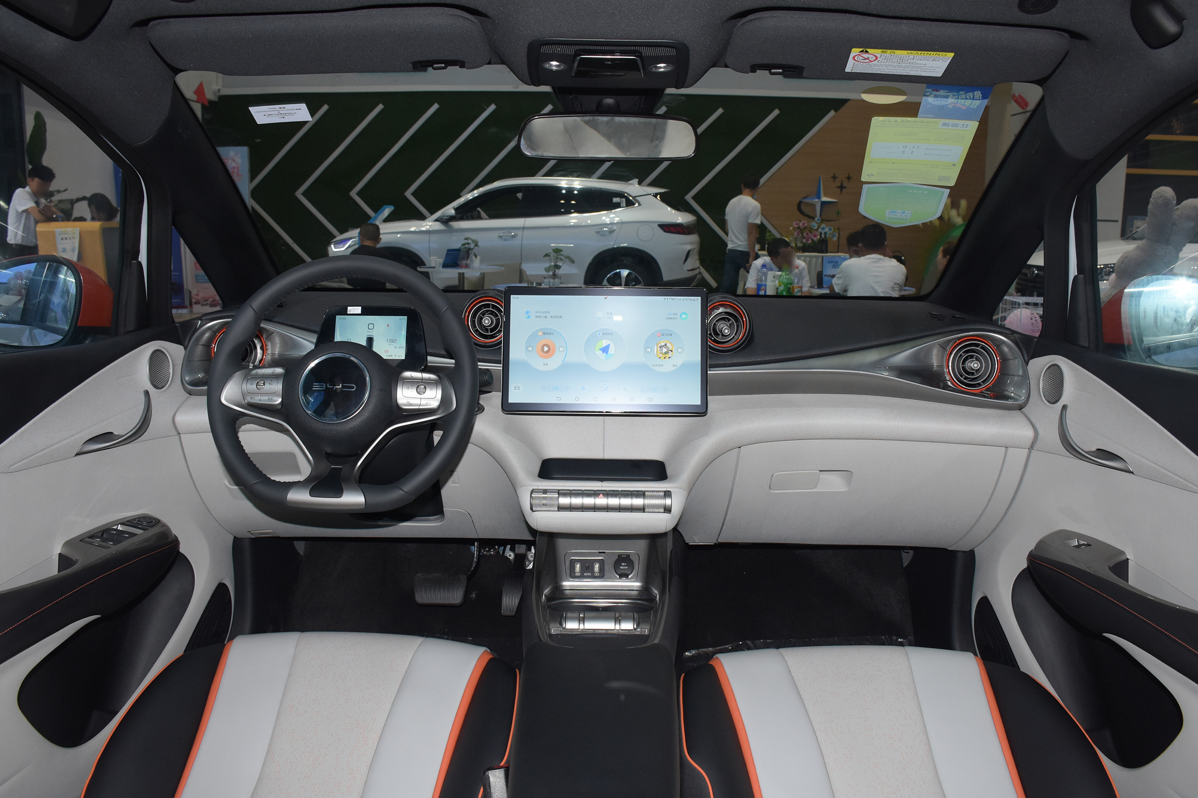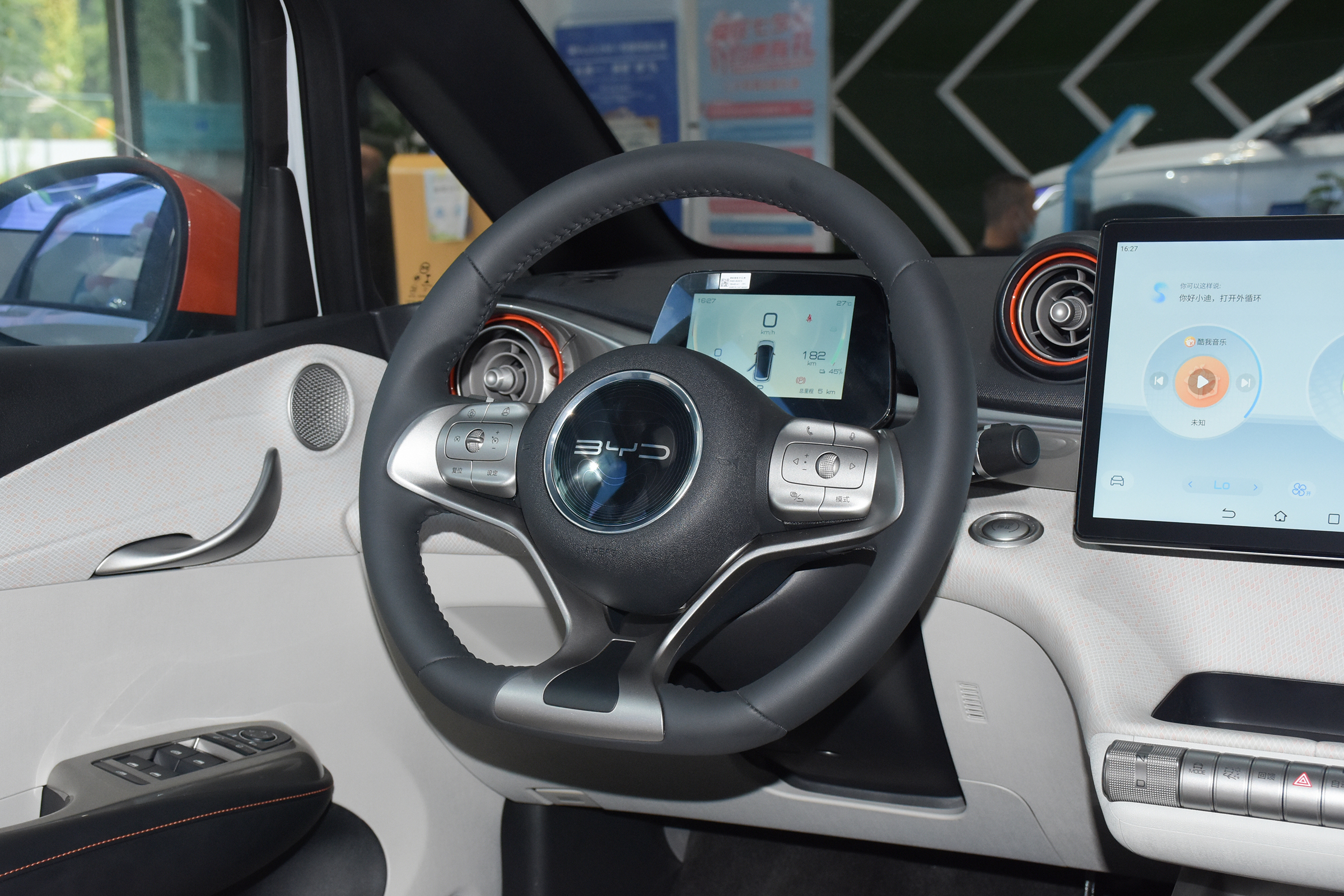 來到車內,海豚的車內色彩搭配與車外保持了一致,中控臺上的線條流暢柔和,再加上鮮明的色彩點綴,整個內飾的氣氛也是比較活潑的。