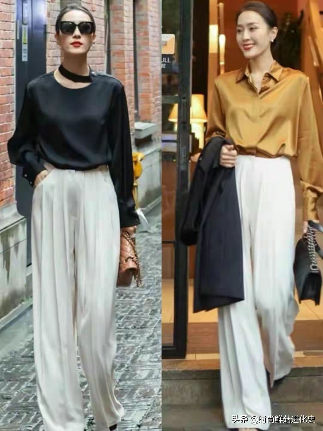 襯衫在秋季是中年女生比較常穿到的上衣款式之一。這款白色襯衫的顏色經典大方,設計不缺乏細節。在領型處拼接了卡其色的面料設計,有效打破了純色襯衫的單調乏味。腿上搭配卡其色的闊腿褲,風格與襯衫保持了一致,整體搭配協調顯成熟韻味。