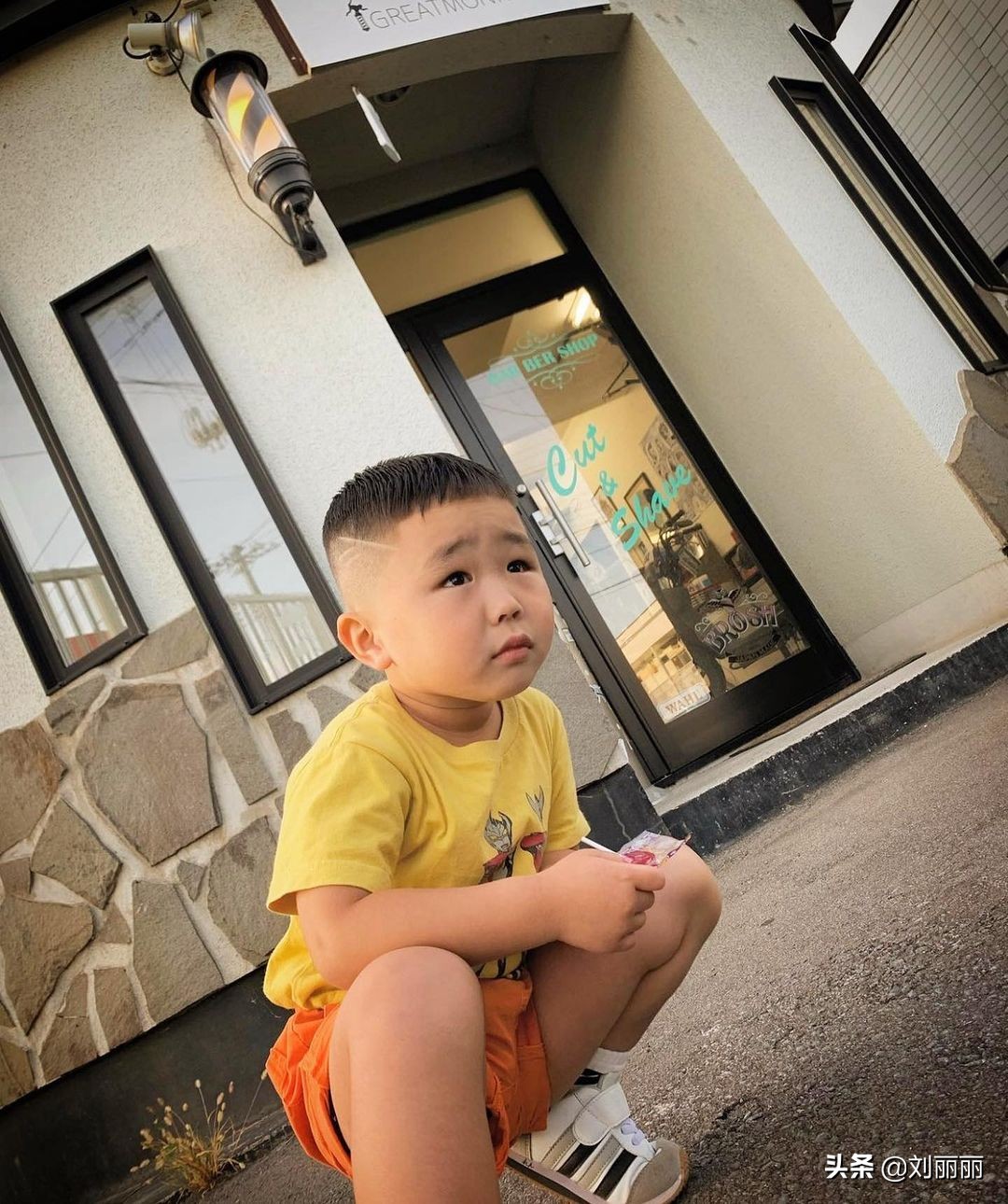 第五款小男孩髮型屬於刻痕碎平頭,周邊依然保留了平頭的清爽利落,直接推成超短髮,同時加入一道前低後高的斜線刻痕,頭頂保留大概一寸左右的長度,修剪碎發的效果,清涼時尚很帥氣。