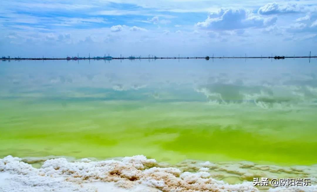 青藍色的湖水、純白色的鹽灘,映著藍天白雲,也是一番靜謐美好。