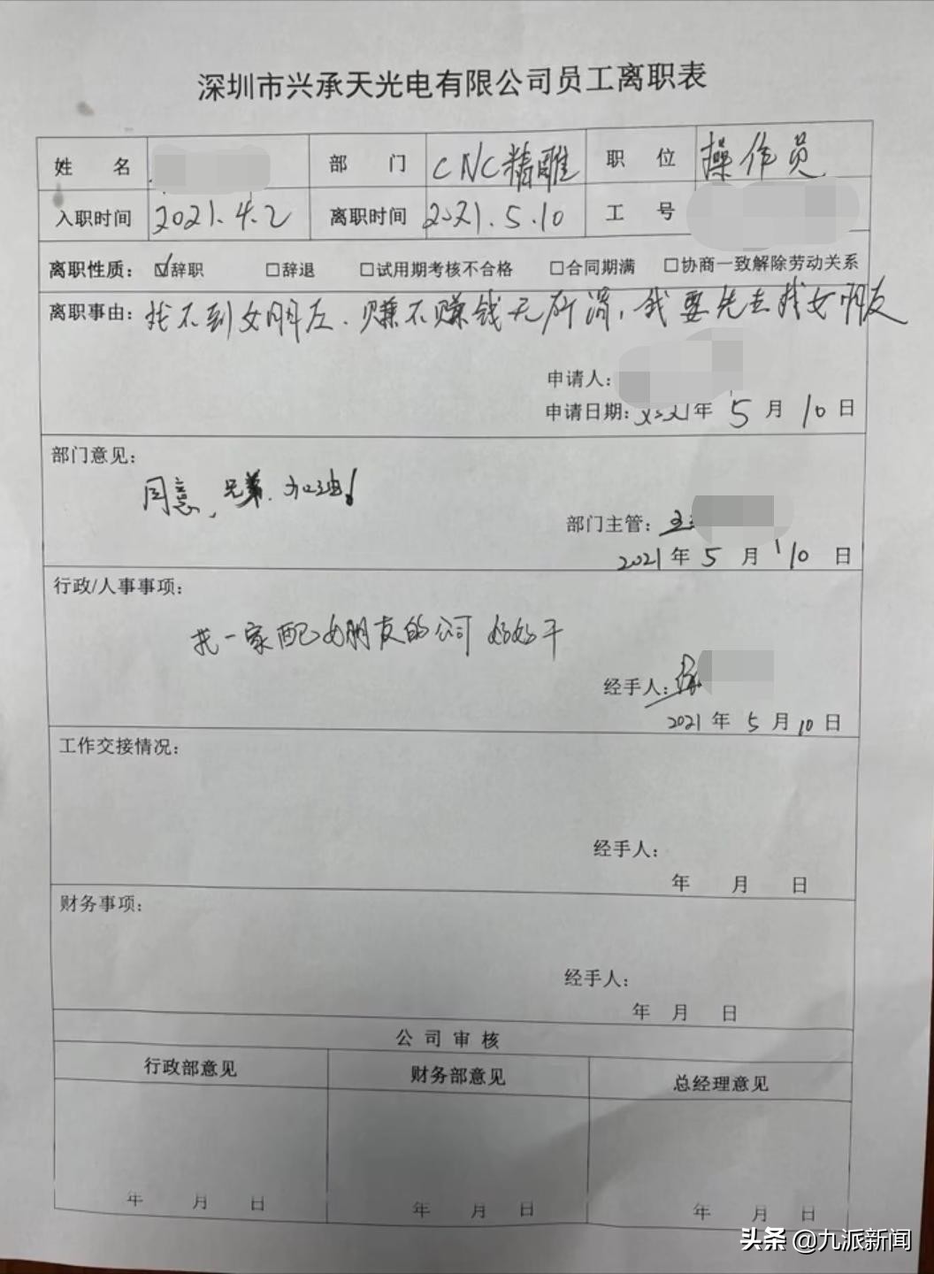 一份深圳興承天光電有限公司員工離職表顯示,這名員工入職時間為4月2日,離職時間是5月10日。