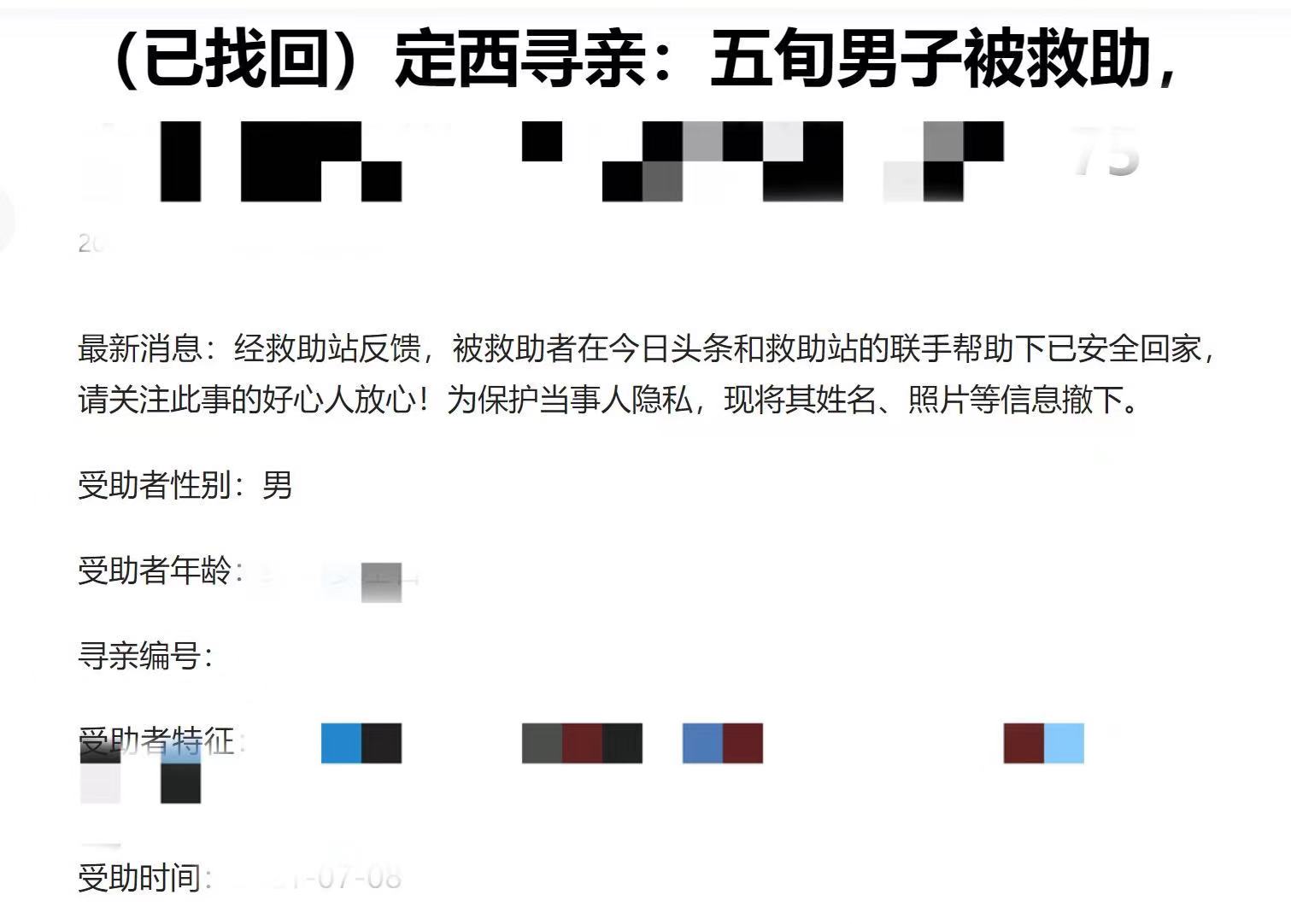 直到救助站的電話打來,秦一文才得知兒子秦奎正在救助站內。原來,救助站聯絡了與合作關係的頭條尋人項目組,請後者幫忙發布秦奎的尋親資訊。後者在收到秦奎的資料後,立即為他安排了彈窗,在雙方的共同努力之下,秦奎終於得以回家。
