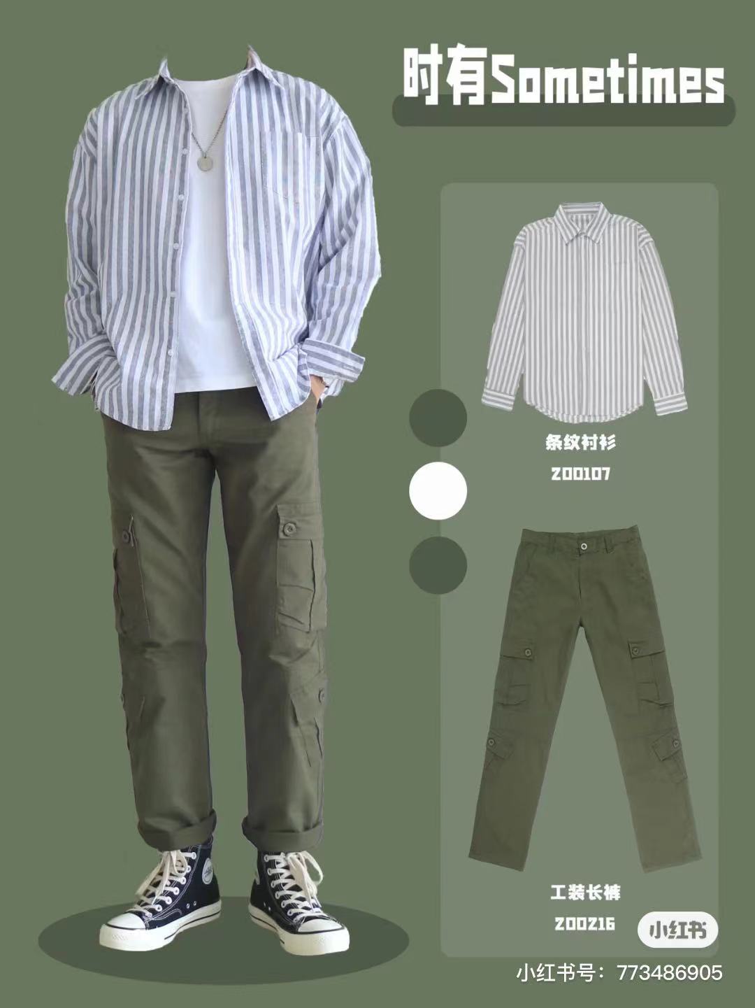 Look3⃣️灰色條紋襯衫+白t+軍綠工裝褲+黑色高幫帆布鞋,鹽系男友風