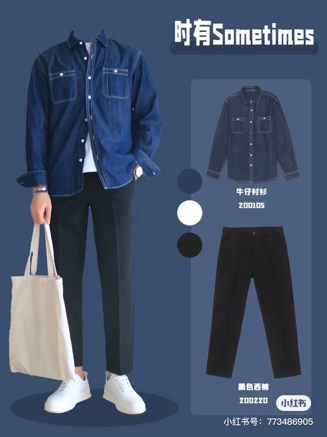 Look5⃣️藏藍牛仔襯衫+白t+黑色九分西褲+小白鞋+帆布包,清爽乾淨文藝休閒