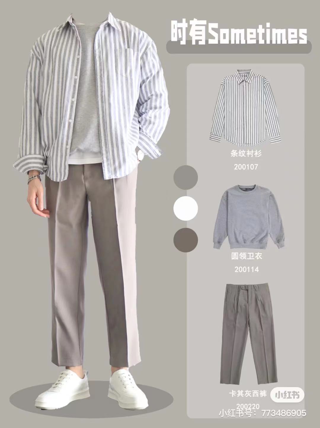 Look1⃣️灰色條紋襯衫+灰色衛衣+白t打底+卡其灰西褲+小白鞋,同色系灰色穿搭
