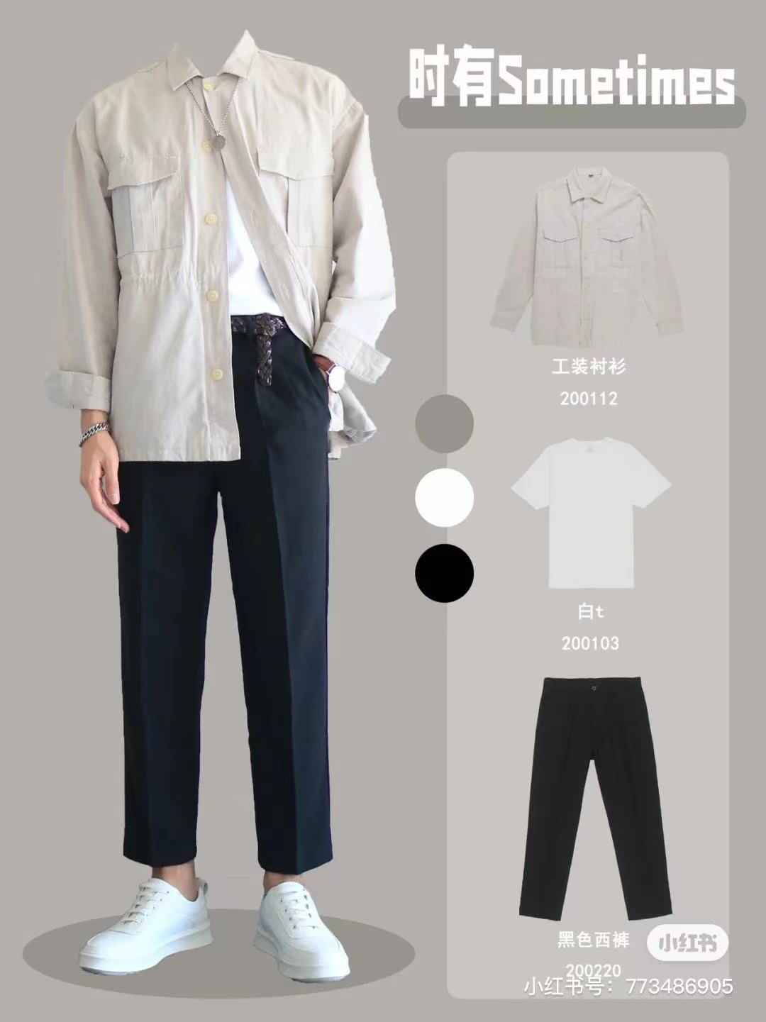 Look2⃣️杏色工裝襯衫+白t+黑色九分西褲+小白鞋,清爽簡約