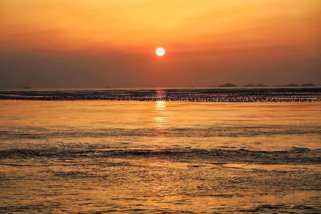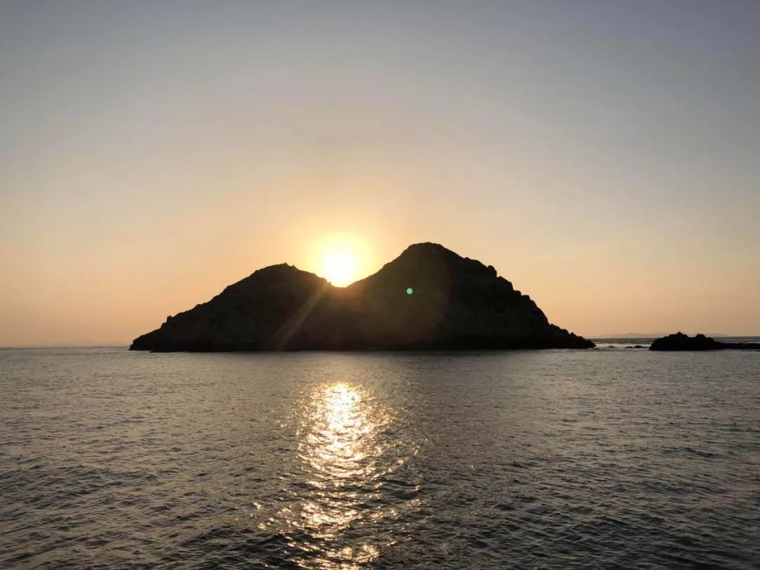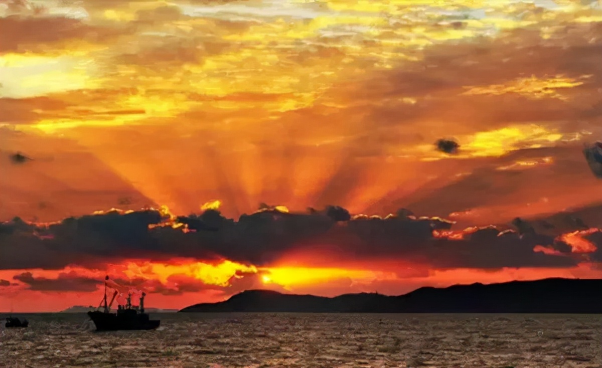 夕陽映照下的大海閃著橙黃色的光芒,船隻陸續返程,一切顯得安靜而和諧。海面上泛紅的陽光提醒著你短暫的一天即將結束。