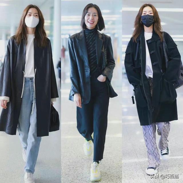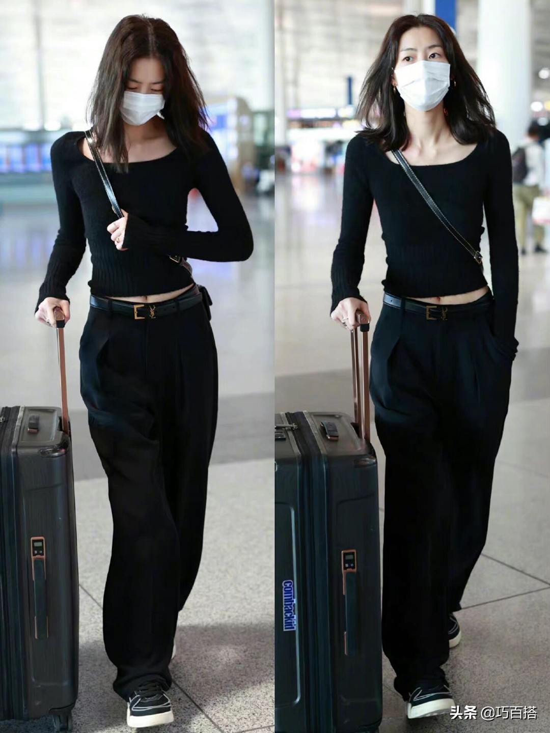 如果你擁有身材方面的問題,可以借鏡劉雯的這組機場穿搭。一件黑色的廓形外套,百搭的同時還能藏匿各種身材問題。而外套敞開穿,露出高腰線內搭,既可以加強了層次感,還能打造出高瘦颯的look。